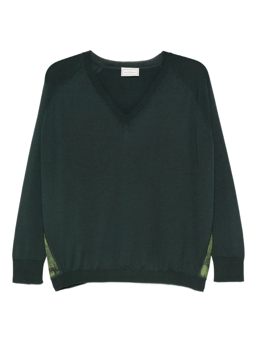 V-neck panelled sweater Highlights - Green - V-neck - Long sleeves - Panelled design - Ribbed cuffs and hem Made in Italy Composition Wool 100%, Silk 100% Washing instructions Read Manufacturer Guidelines