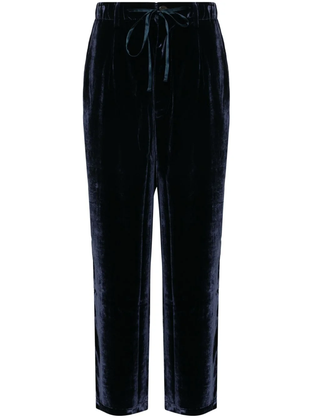 velvet trousers Highlights - Navy blue - Velvet - Piped-trim detailing - Elasticated drawstring waistband - Belt loops - Two side inset pockets - Two rear welt pockets - Front button and zip fastening Made in Italy Composition Viscose 82%, Silk 18% SIZE & FIT Model measurements Height 5 ft 9 in(1.75 m) Bust/Chest 32.67 in(83 cm) Hips 36.22 in(92 cm) Waist 24.8 in(63 cm) FittingInformation Designed with a wide-leg cut, these trousers allow for a close fit at the waist and offer a loose and roomy fit over the leg Adjust this piece’s waistband to your preference using the drawstring Made from a midweight non-stretch fabric This piece fits true to size – take your usual size Washing instructions Dry Clean Only