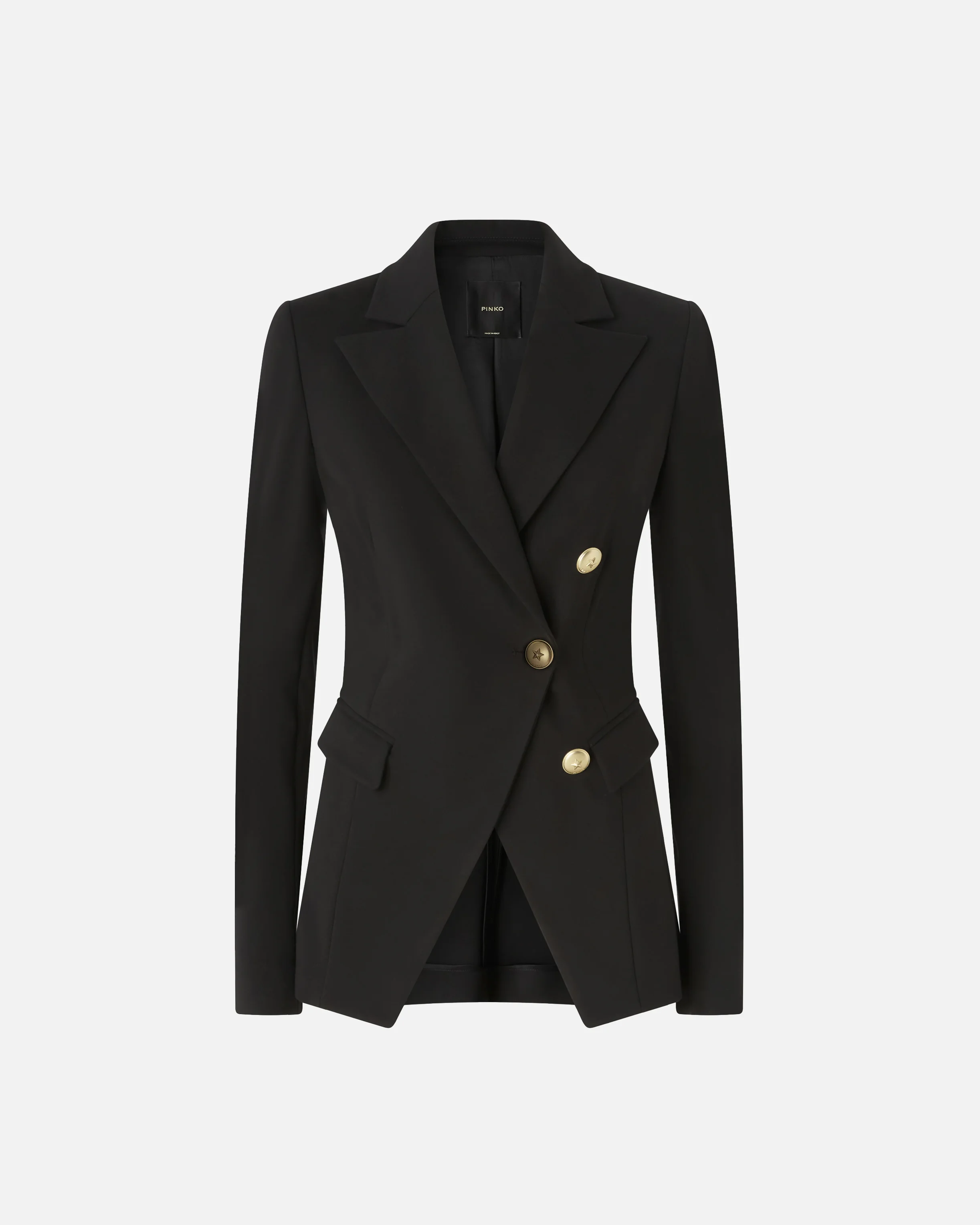 GRANITA JACKET − 105573A24CZ99 Women's elegant blazer jacket in technical, full Milano-knit stretch viscose fabric processed in a special way to give the material a smooth, compact texture. However, the true star of the design is the star-decorated button fastening, arranged in such a way as to create a distinctive asymmetrical double-breasted buttoning effect. The garment has a lined rear yoke to ensure comfort and improve the fit, while the rest of the interior is unlined to make the most of the movement of the fabric. This fitted style is more cinched on the sides. Pair the blazer with the trousers in the same fabric to create a suit effect or with a shirt for a slightly but not overly formal look. COMPOSITION Outside Fabric: VISCOSE 67% POLYAMMIDE 28% POLYAMIDE 28% ELASTANE 5% - Lining: ACETATE 67% POLYESTER 33%