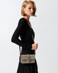 LOVE ONE SLOUCHY BABY − 105353A20DZZLQ00001 Sophisticated slouchy baby bag completely covered in rhinestones that create the iconic monogram pattern with a sparkling and glamorous effect. The studded surface catches the light, giving luminosity and precious character to the accessory, while the compact structure with a front flap and magnetic closure guarantees practicality for daily use. The metallic logo embellishes the front closure, completing the luxury design, combined with a metallic chain and leather shoulder strap for versatility of wear. The applied crystals form an all-over pattern that gives refinement and distinctiveness, transforming the accessory into a true statement piece with a strong visual impact. Perfect for lighting up evening outfits or adding glamour to casual looks, it pairs beautifully with solid-colored garments to enhance the sparkling effect. COMPOSITION Outside Fabric: Silica 100% SILICON DIOXIDE 100% - Internal: CALF LEATHER 100% CALFSKIN LEATHER 100% - Accessory: Zinc 100% MEASUREMENTS - Height: 11 cm - Width: 4 cm - Length: 18 cm