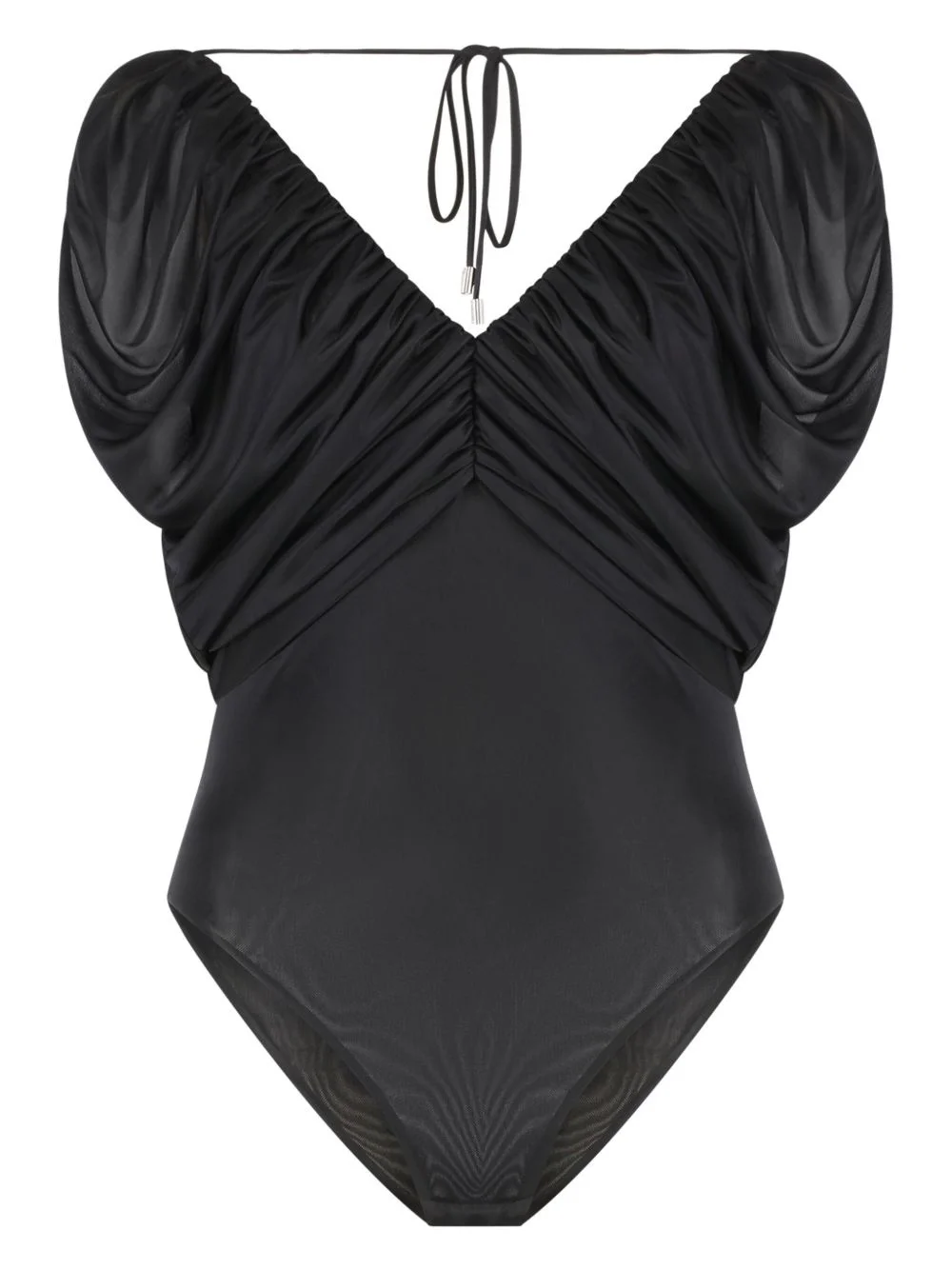 Beccafico bodysuit Highlights - Black - Rear tie fastening - Press-stud fastening - Draped detailing - Just a reminder that this piece must be tried on over your own garments. Made in Italy Composition Polyester 100%, Nylon 97%, Spandex/Elastane 3% SIZE & FIT FittingInformation Designed for a slim fit that sits just away from the body offering a close yet comfortable fit Made from a midweight non-stretch fabric, this piece offers minimal elasticity when worn