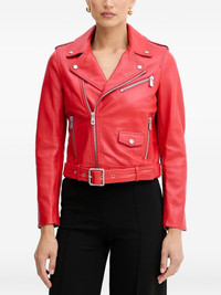 belted zip-front leather biker jacket Highlights - Red - Leather - Asymmetrical zip fastening - Belted waist - Multiple zip pockets - Snap button detailing Imported Composition Lining: Polyester 100% Outer: Leather 100% Washing instructions Read Manufacturer Guidelines