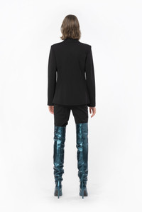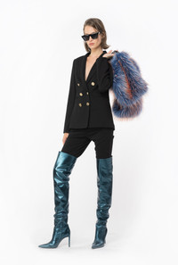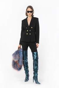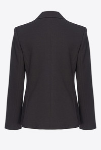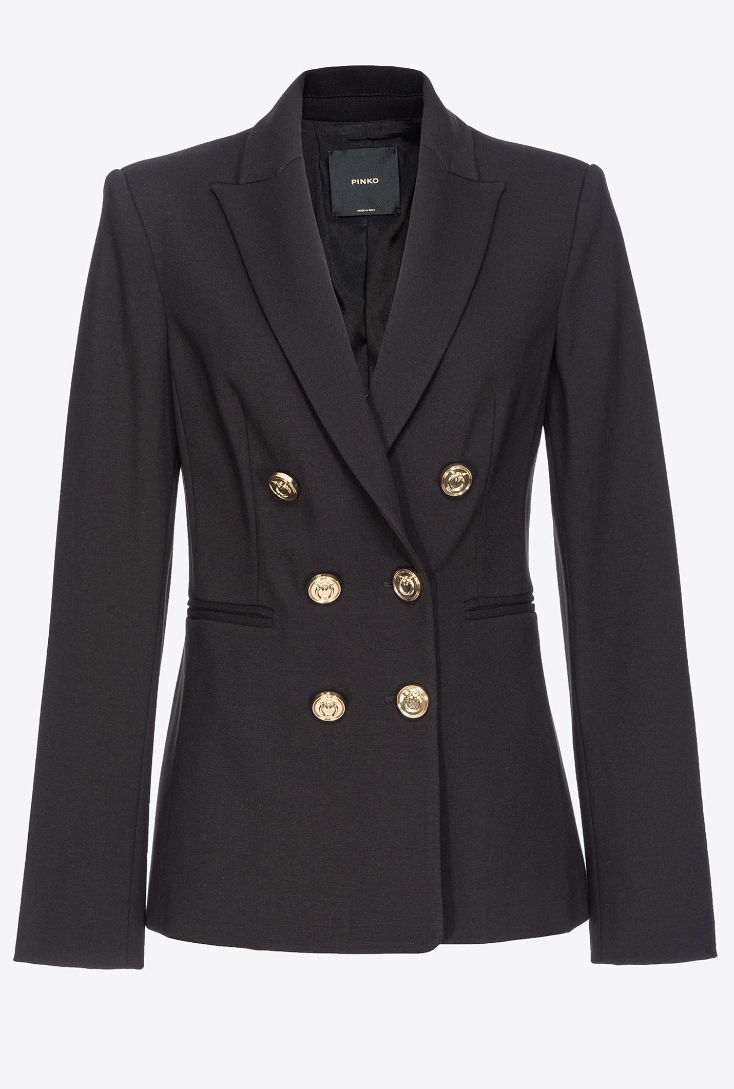Blazer in technical, full Milano-knit stretch viscose fabric. Cinched waist, lapel collar, long sleeves and double welt pockets at the sides. Lined. Double-breasted fastening with metal buttons. COMPOSITION Outside Fabric: VISCOSE 67% POLYAMMIDE 28% POLYAMIDE 28% ELASTANE 5% - Lining: ACETATE 68% POLYESTER 32%