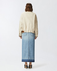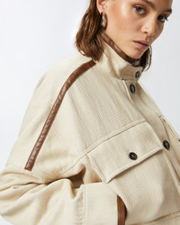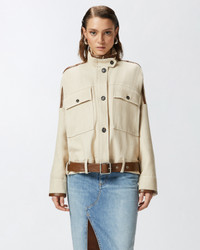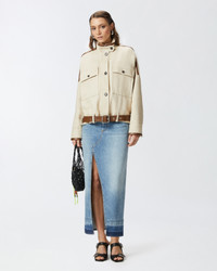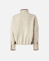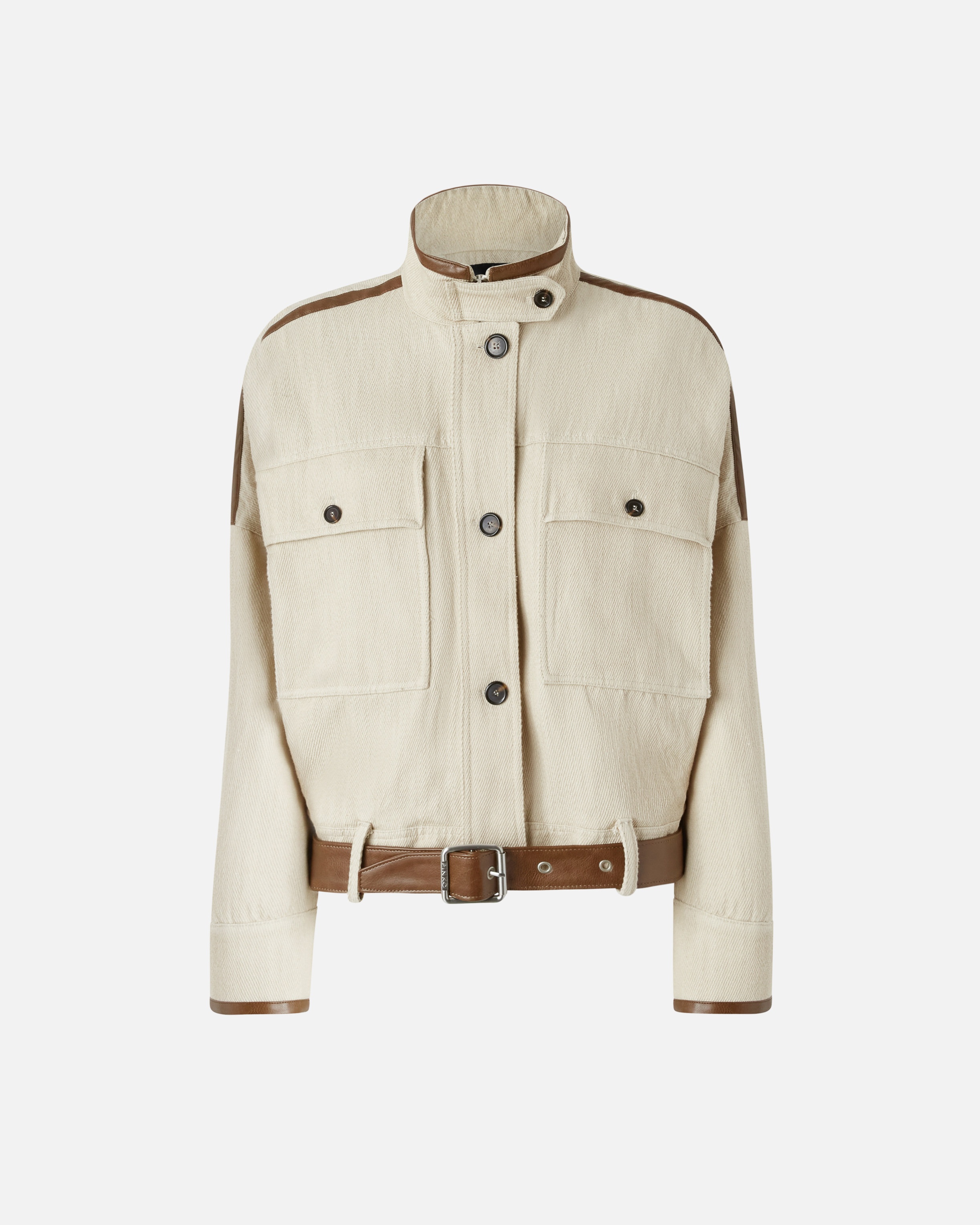 BABILONIA BLOUSON − 104764A2FXC36 Cropped, relaxed-fit blouson jacket in diagonally woven, coarse-textured cotton- and linen-blend fabric with edging in leather-effect coated fabric. This jacket—the perfect outerwear piece for the early season—has a small stand-up collar fastened with a buttoned tab, wide and low set-in long sleeves, maxi patch pockets with flap and an in-seam side pocket. This blouson jacket is lined and lightly padded for greater comfort when worn and features a faux leather belt at the bottom, rounding off the design and allowing you to tailor the fit. The metal zip fastening is accompanied by a buttoned placket. COMPOSITION 1° Outside Fabric: COTTON 65% LINEN 32% POLYESTER 3% - 2° Outside Fabric: POLYESTER 100% - coating: POLYURETHANE 100% - Lining: POLYESTER 97% ELASTANE 3% - Padding: POLYESTER 100%