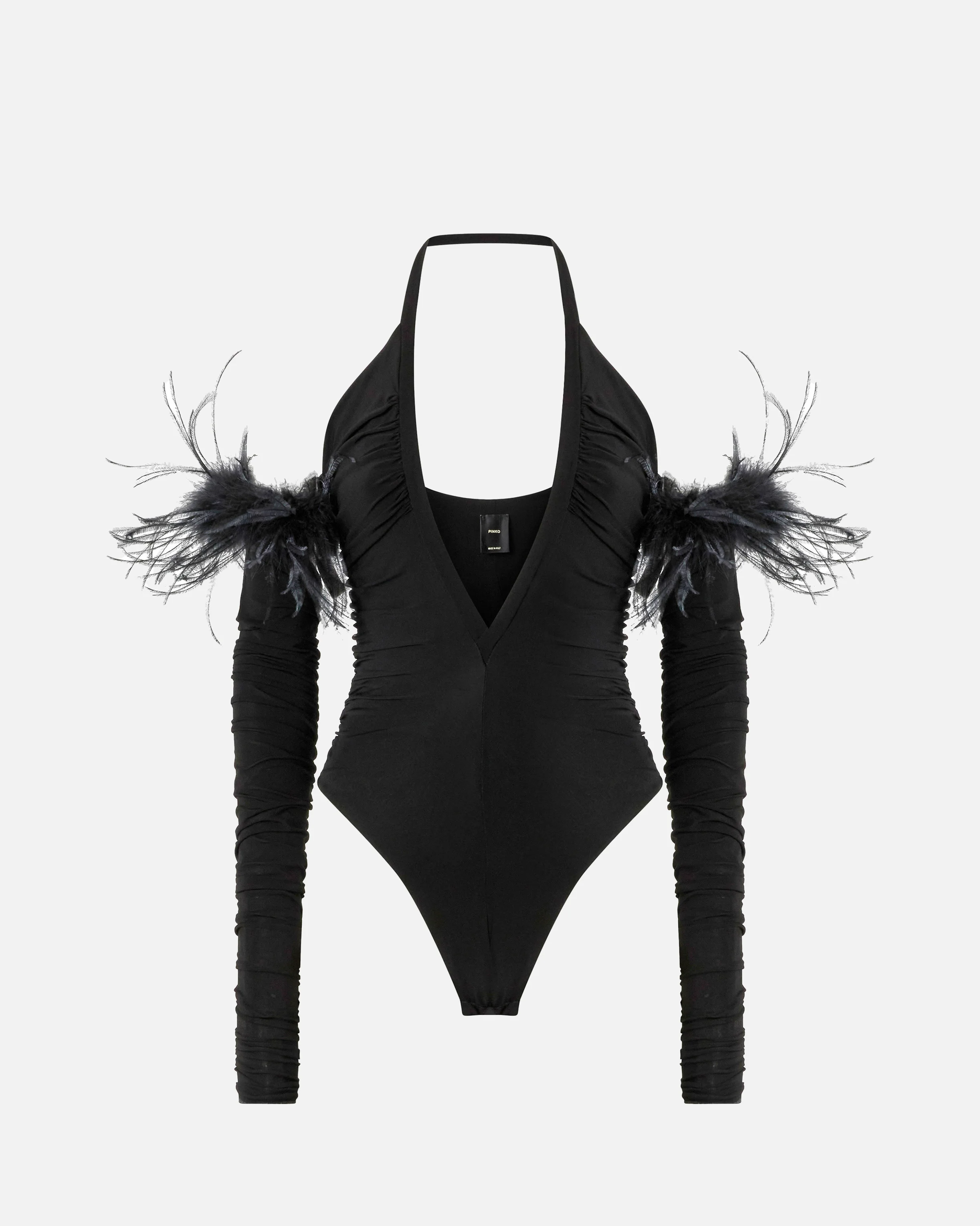 OTTOVOLANTE BODYSUIT − 105483A2GSZ99 Lightweight jersey bodysuit with detachable shoulders and sleeves by means of a button, which offers different wear options. The lightness of the material allows you to create draping and gathering for an extremely feminine and refined silhouette. The distinctive detail of the piece is provided by the plunging neckline and the feather applique mounted on a detachable grosgrain ribbon, which in addition to adding a touch of style, also become a real gem to wear around the neck. This design is destined to become the ace up your sleeve when the dress code is of a high standard. COMPOSITION Outside Fabric: VISCOSE 94% ELASTANE 6% - : TURKEY FEATHERS 70% TURKEY FEATHER 70% Ostrich feather 30% OSTRICH FEATHER 30%
