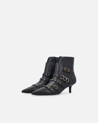 SD0361P087-Z99 Leather booties with 14 cm-high leg shaft and slender 5 cm-high heel. This model combines geometric shapes to perfection, with buckles, flat mini studs and loops of different forms and sizes skilfully alternated to dynamic effect. These gold- and silver-coloured metal details enhance the design, giving it a sophisticated and bold edge, but the final touch is provided by the small electroplated metal Love Birds logo adorning the loop of the upper strap. Wear this pair of shoes with tailored trousers for the perfect office look. COMPOSITION Lining: CALF LEATHER 100% CALFSKIN LEATHER 100% - : CALFSKIN LEATHER 54% CALF LEATHER 54% POLYURETHANE 46% - Sole: CALF LEATHER 100% CALFSKIN LEATHER 100% - Sole: ELASTODIENE 100% RUBBER 100% MEASURES W: 1.35 g
