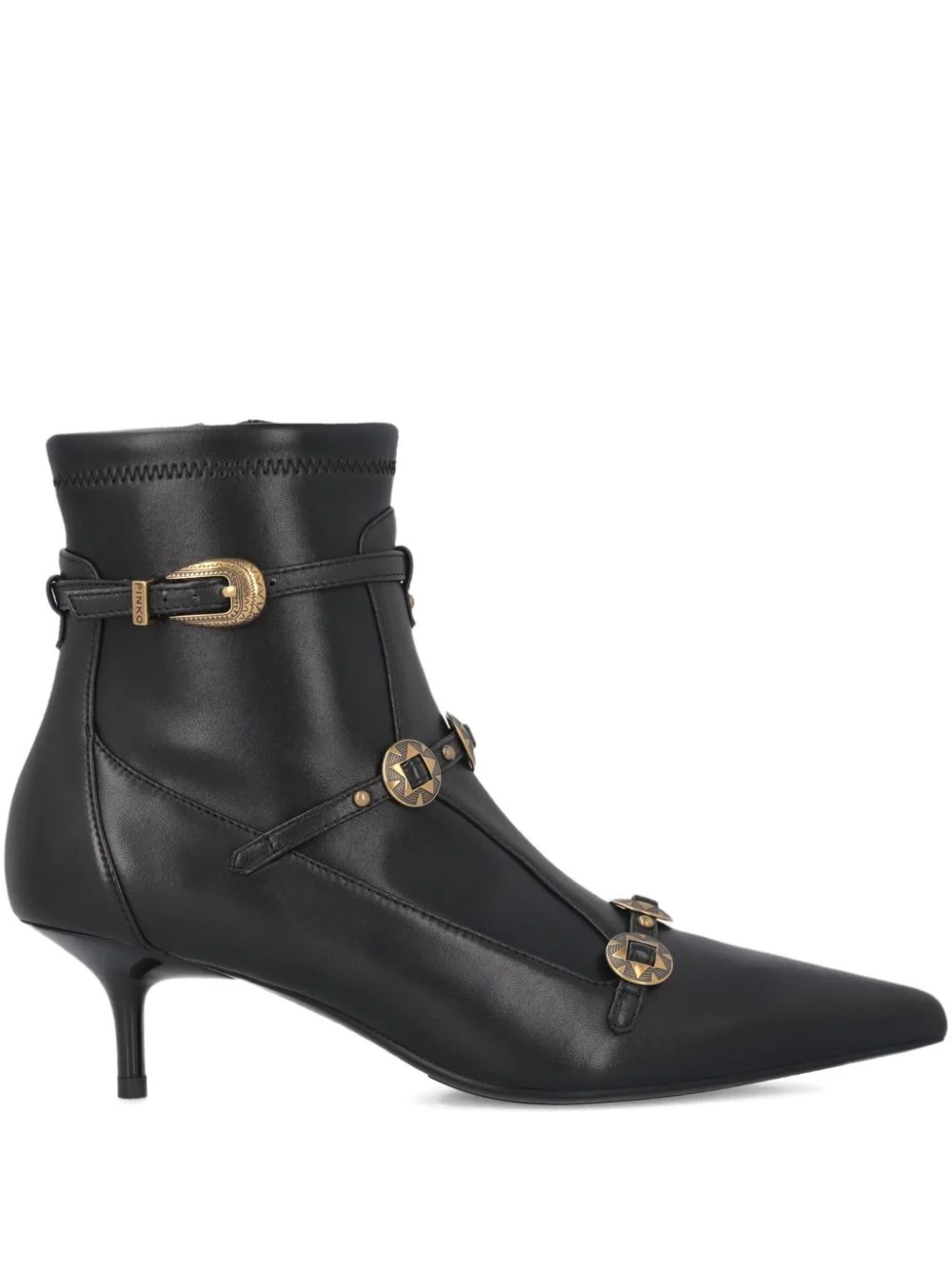 buckle-embellished leather boots Highlights - Black - Buckle detail - Gold-tone embellishment - Pointed toe - Stiletto heel - Side zip fastening Imported Composition Outer: Calf Leather 100% Lining: Calf Leather 100% Sole: Calf Leather 100%