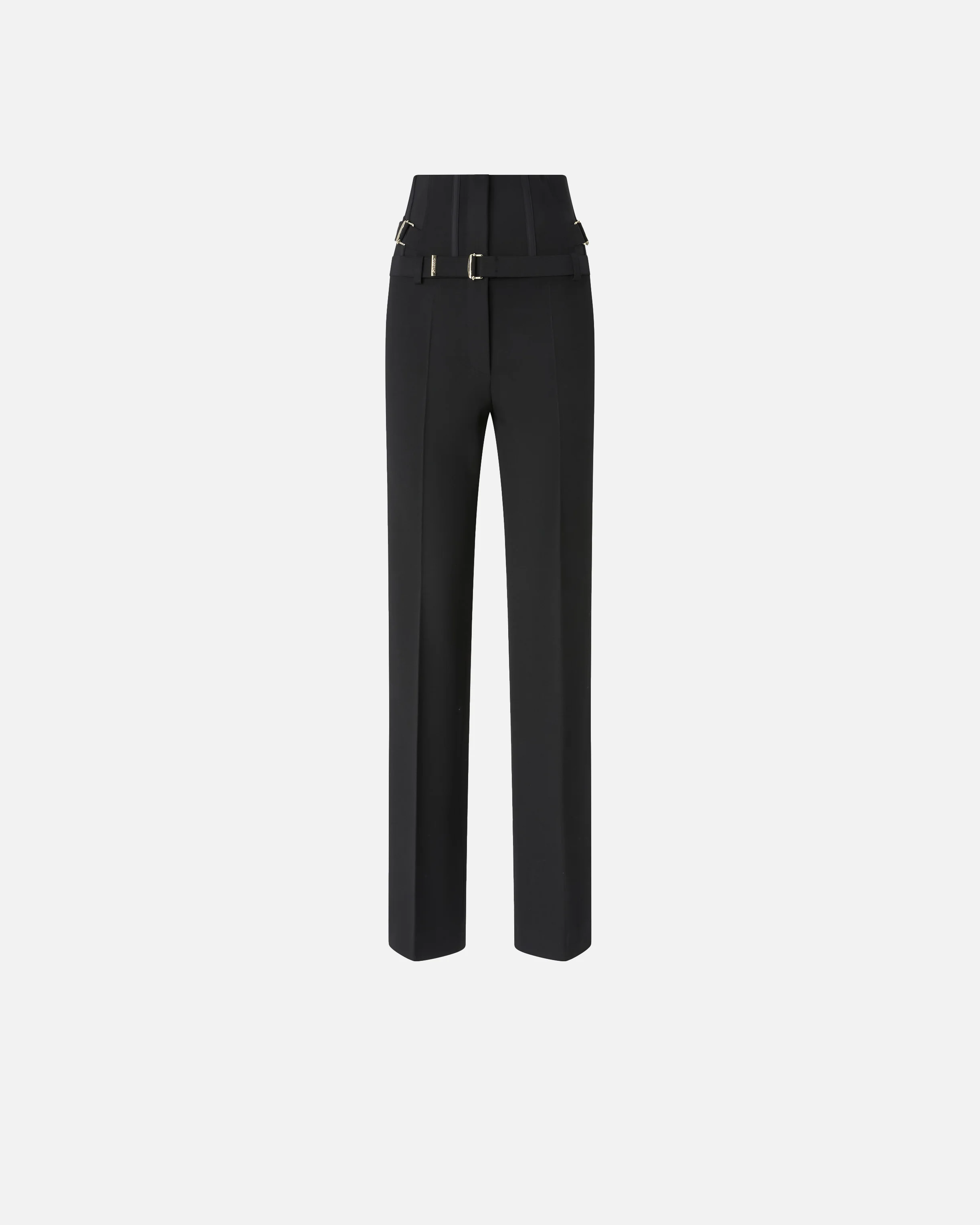 PIADINA TROUSERS − 105654A2QVZ99 Straight-leg trousers featuring a very high-waisted design with boning reminiscent of a female bustier. The poly viscose crepe, a particularly versatile and high-performance double fabric thanks to its two-way stretch construction, has undergone high-quality treatments that allow it to achieve a sophisticated woolly appearance. The style is completed by belt loops, waist straps to adjust the fit according to your needs, and a hidden front fastening. Balancing masculine and feminine styles, these trousers will make your most formal looks of the new season special. COMPOSITION 1° Outside Fabric: POLYESTER 68% VISCOSE 29% ELASTANE 3% - 2° Outside Fabric: POLYESTER 75% ELASTODIENE 25% RUBBER 25%