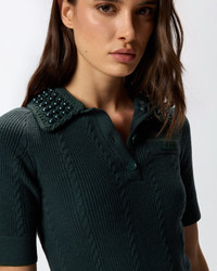 EOLIE POLO − 105484A2QZX34 Short slim-fit polo-style sweater in a viscose-blend knit fabric. The design is animated by the alternating cable knit and rib knit, as well as being embellished by the pearl detailing in the same colour on the collar. The sleeve trims and hem are elasticated, while the tone-on-tone label with the PINKO lettering logo stands out on the front. The piece has undergone finishing tests to minimise the possible formation of pilling, ensuring greater fabric softness and durability. Practical, original and with unique style: this style is destined to become a real go-to piece. COMPOSITION Outer Yarn: ACRYLIC 62% POLYESTER 28% WOOL 10% - Neck: COTTON 100% - : ACRYLIC RESIN 100% ACRYL.RES. 100%