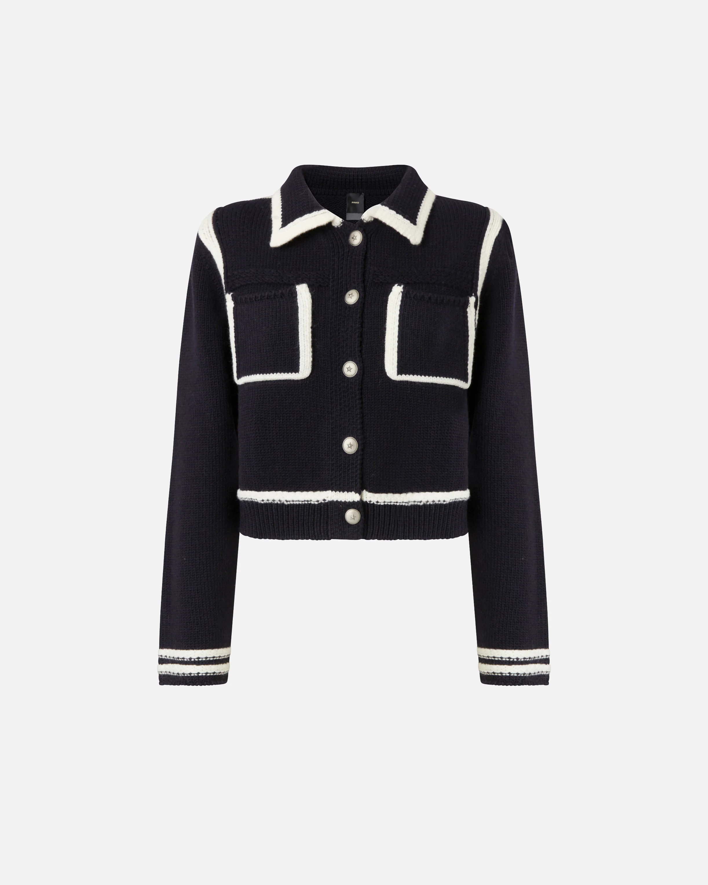 SULCIS JACKET − 105498A2PLEZ1 Preppy-style cardigan in fine and soft merino wool. The design features a contrasting yarn that highlights the cuffs, yoke, hem, collar and front pockets. The final touch is given by the tone-on-tone label with PINKO lettering logo behind the neck. The piece has undergone finishing tests to minimise the possible formation of pilling, ensuring greater fabric softness and durability. Front fastening with star-decorated metal buttons. Practical, original and on-trend: this style is destined to become the real ace up your sleeve in your wardrobe. COMPOSITION Outer Yarn: WOOL 100%