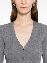 button ribbed cardigan Highlights - Grey - Ribbed knit - Button fastening - Long sleeves - Logo at the rear Imported Composition Wool 77%, Polyamide 17%, Polyester 6% SIZE & FIT Model measurements Height 5 ft 10 in(1.79 m) Bust/Chest 33.46 in(85 cm) Hips 34.64 in(88 cm) Waist 23.62 in(60 cm) Washing instructions Hand Wash