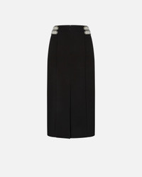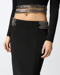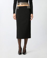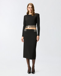 CHELA SKIRT − 105954A2YHZ99 Midi sheath dress in compact stretch crepe with a fluid feel, constructed with shaped panels that sculpt the high waist and fall in a straight line to the calf; the sides are decorated with hand-applied shiny metal chain embroidery, a jewel detail that illuminates the essential silhouette; invisible zip closure and small back slit to facilitate the step, interior finished with clean topstitching and light lining for maximum comfort. Wear it with a crop top or an oversized shirt for a sophisticated contrast of volumes. COMPOSITION Outside Fabric: POLYESTER 78% VISCOSE 18% ELASTANE 4% - Lining: POLYESTER 100% - Accessory: copper 100% COPPER 100%