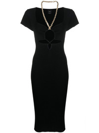 chain-strap cutout ribbed-knit midi dress PINKO’s midi black dress is just as classic as shorter-hemmed versions. Made from close-fitting ribbed-knit, it’s anchored with a chain-link halterneck that attaches to the bust. The artful cutouts are so alluring. Highlights - Black - Knitted construction - Square neck - Chain-link detailing - Halterneck - Short sleeves - Cut-out detailing - Cut-out detailing - Straight hem - Mid-length Made in Italy Composition Viscose 72%, Polyester 28% SIZE & FIT Model measurements Height 5 ft 9 in(1.75 m) Bust/Chest 31.49 in(80 cm) Hips 34.05 in(86.5 cm) Waist 24.21 in(61.5 cm) FittingInformation Designed for a close fit throughout Made with a midweight knit, this piece offers some stretch This piece fits true to size – take your usual size Washing instructions Hand Wash