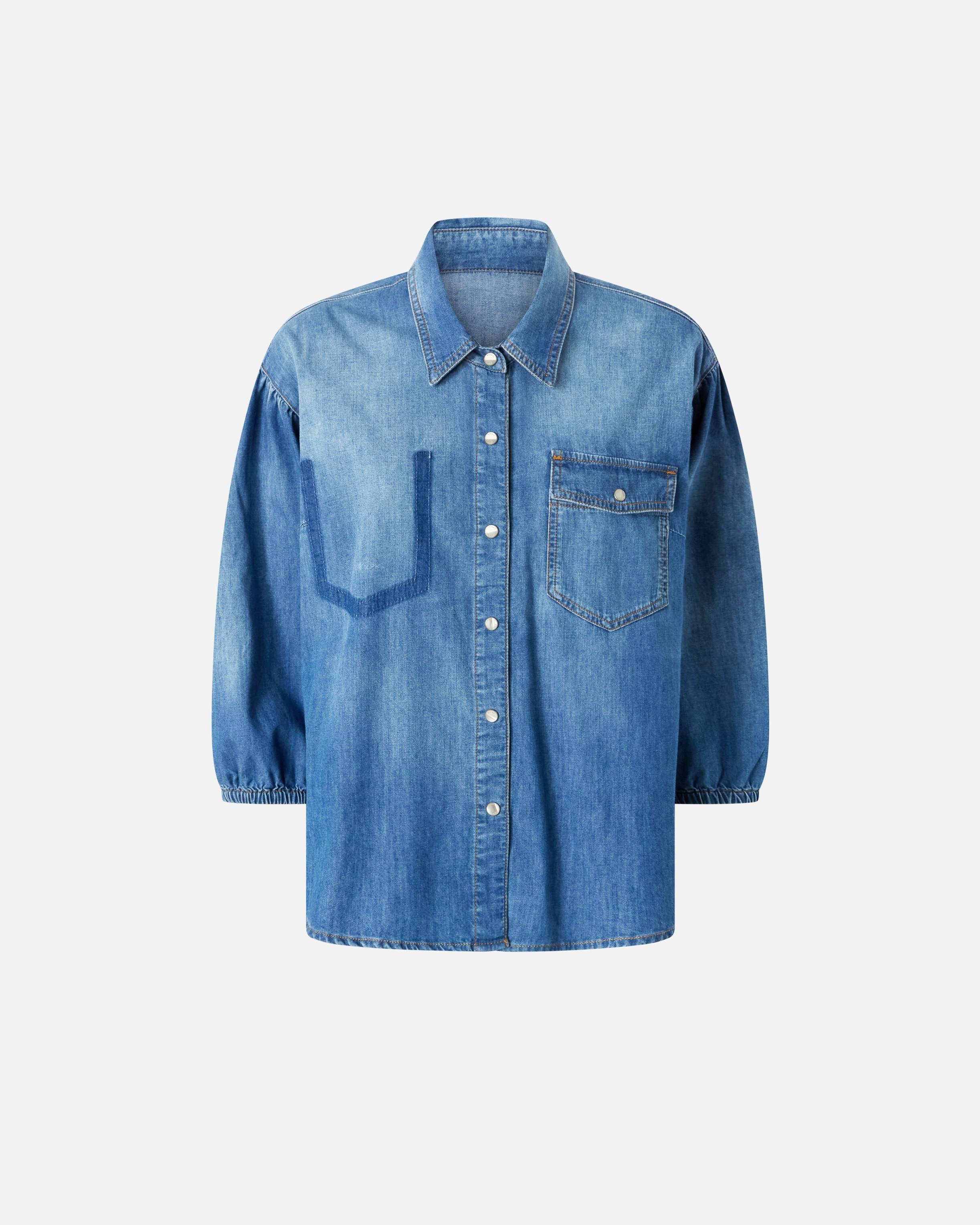 CHOBE CAMICIA − 104629A2DTPJO Women's loose-fitting shirt in light pure cotton denim featuring a light medium wash. The daytime denim shirt is completed by a pointed collar, three-quarter sleeves with a slightly balloon volume with elastic inserted at the hem and a pocket with a pointed flap on the front. Also on the front, the shirt has a darker color motif that follows the shape of a breast pocket. Metal snap button closure. The lightweight denim shirt completes your daytime looks with an iconic detail: pair it with a pair of shorts, a light jacket and mule loafers. COMPOSITION Outside Fabric: COTTON 100%