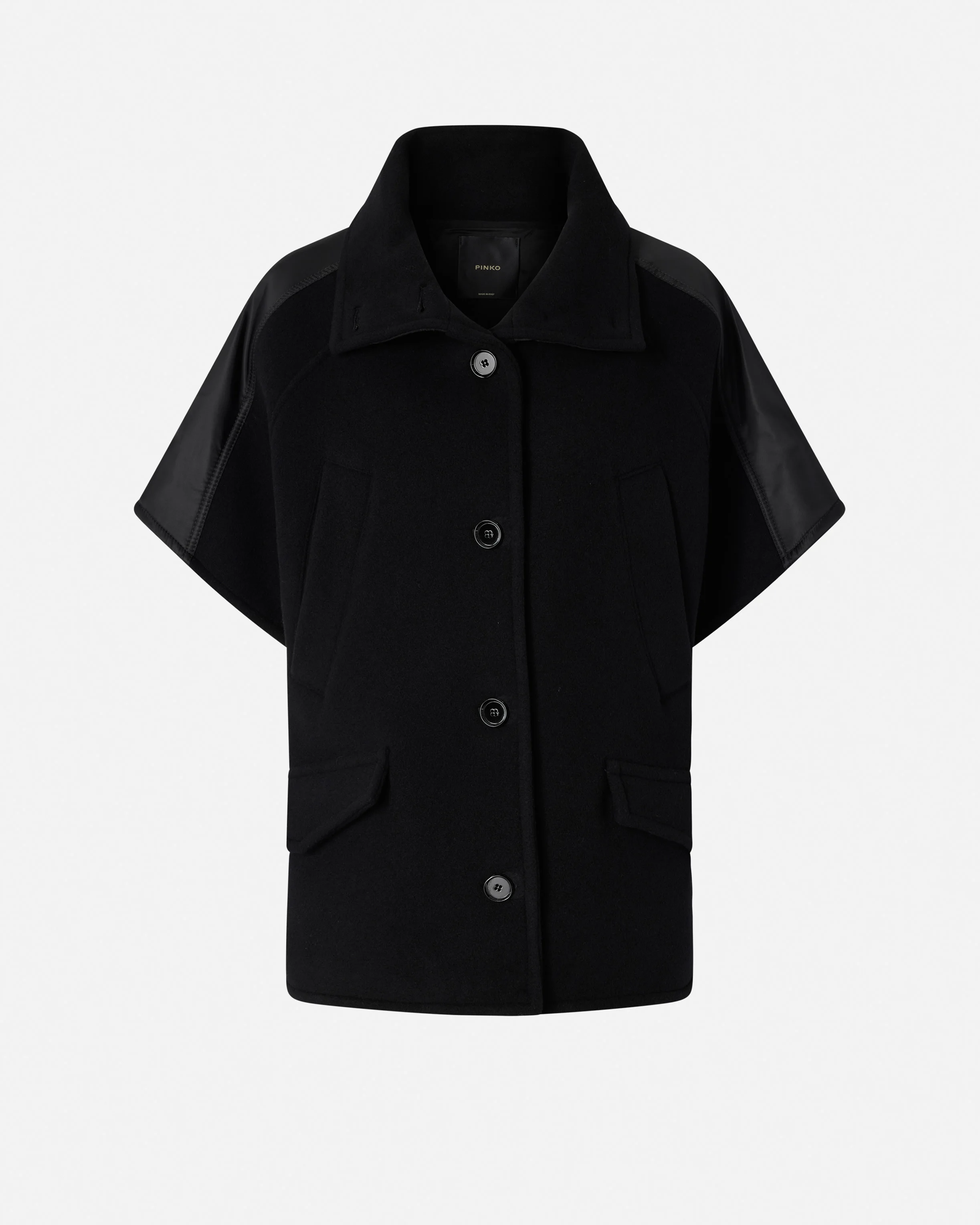CARBONARA CAPPA − 105790A2SLZ99 Short cape with short sleeves and double flap and welt pockets on the front. The style is made from warm, soft wool-blend cloth with a high neck, shoulders and yoke in technical satin. Front button fastening. Thanks to its original but functional design, this cape is ready to become your new favourite outerwear piece in pure PINKO style. COMPOSITION 1° Outside Fabric: WOOL 78% POLYAMIDE 22% POLYAMMIDE 22% - 2° Outside Fabric: POLYAMMIDE 100% POLYAMIDE 100% - Lining: ACETATE 67% POLYESTER 33% - Padding: POLYESTER 100%