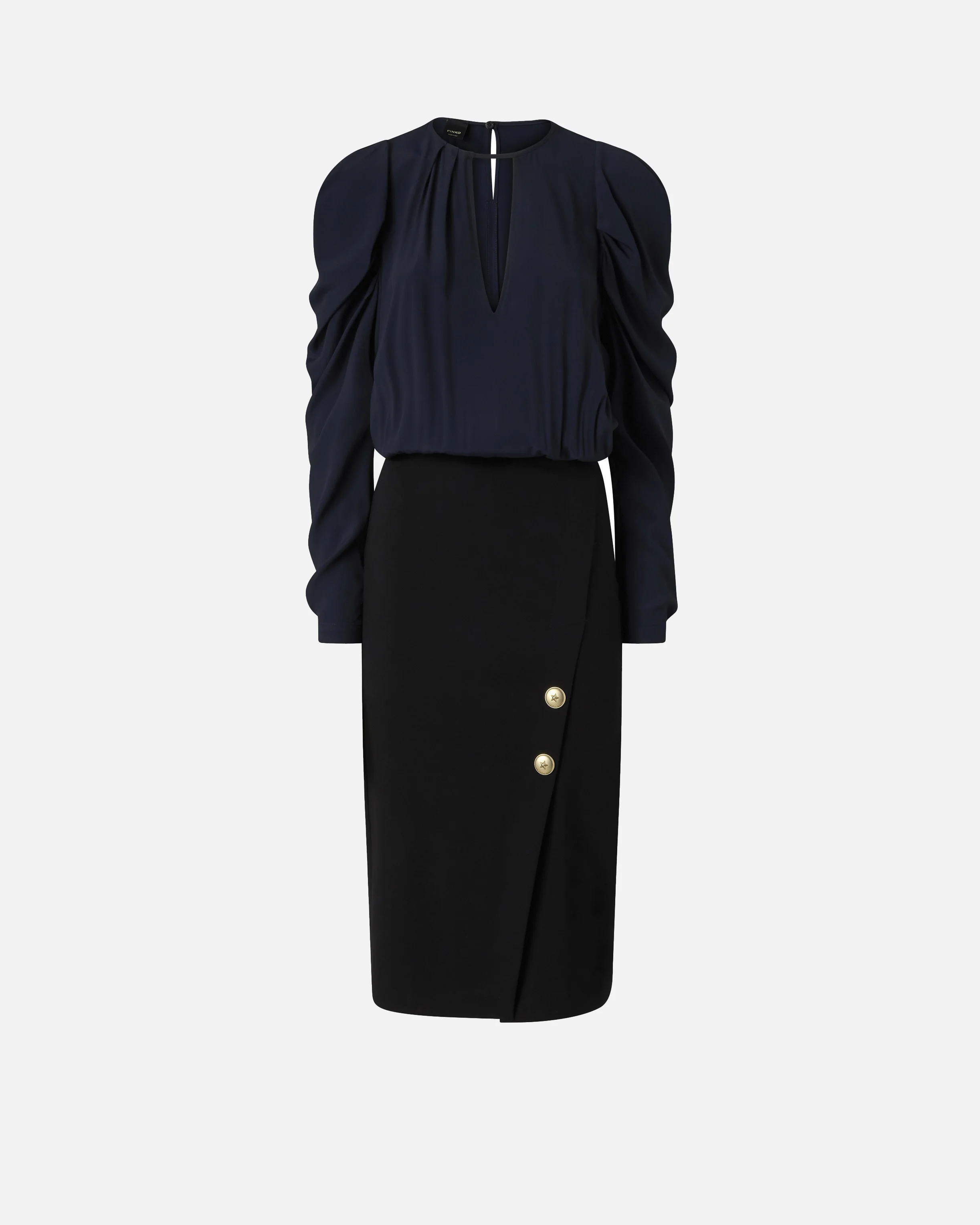 null − 105828A2U8ZE3 Calf-length dress with a pencil skirt, a crew-neck defined by a deep V-shaped opening on the front, and long draped sleeves completed by soft ribbons that tie on the cuffs. The garment features a bi-material construction, combining a fluid silk-blend fabric on the top, with a stretch technical viscose full Milano-knit fabric on the skirt. The front is also punctuated by metal star-decorated buttons. This fitted style is more cinched on the sides. Keyhole fastening on the back of the neck and a zip fastening at the side of the skirt. Perfect as an elegant outfit for special evenings out or for an everyday look where the dress code calls for sophistication. COMPOSITION 1° Outside Fabric: VISCOSE 67% POLYAMMIDE 28% POLYAMIDE 28% ELASTANE 5% - 2° Outside Fabric: ACETATE 69% SILK 31% - Lining: POLYESTER 100%
