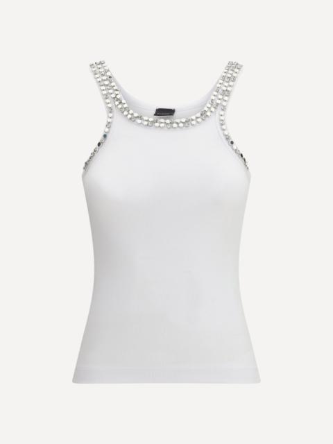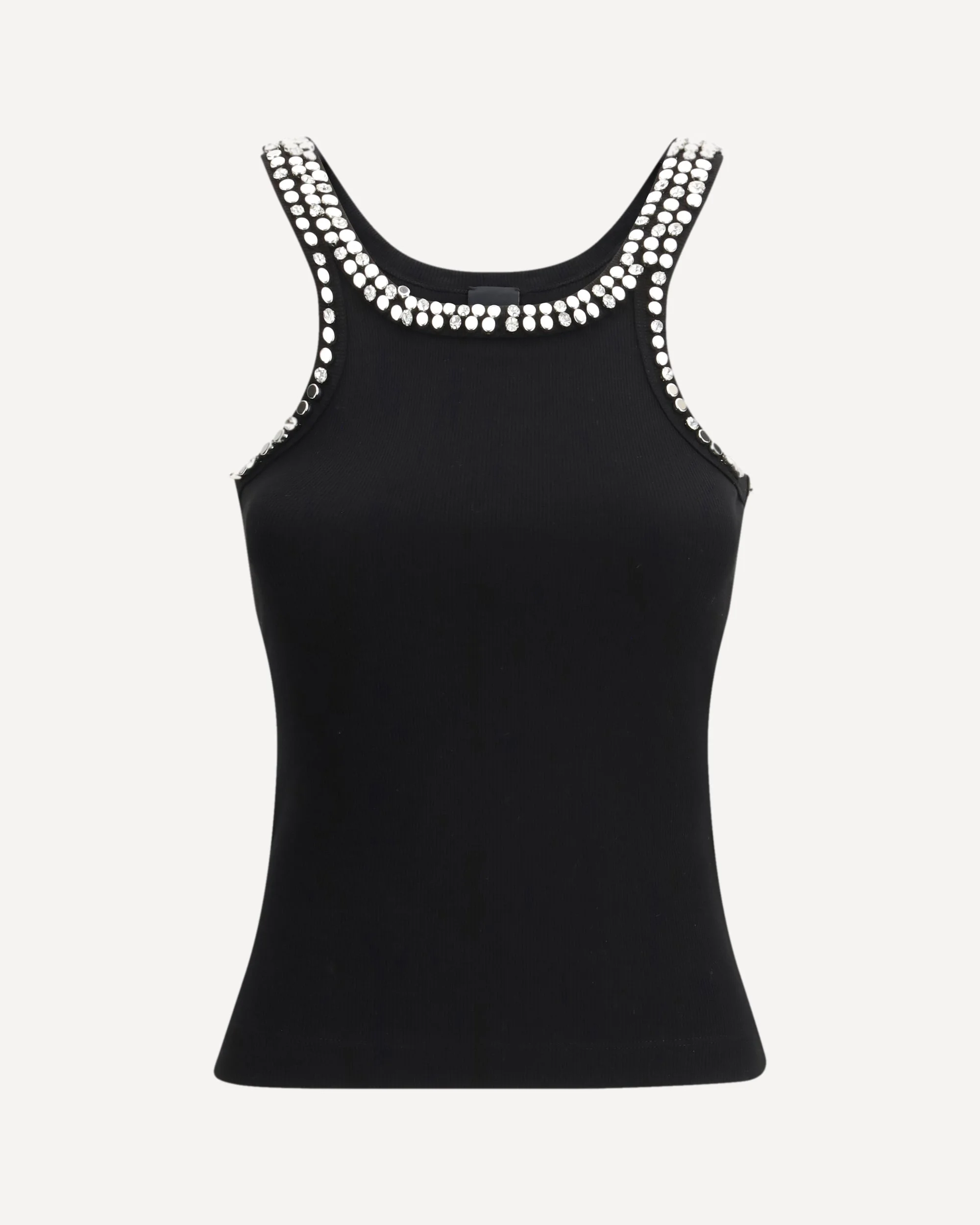 The Coriandoli Top by Pinko brings a refined sense of femininity through its ribbed cotton jersey construction. The deep neckline and straps are embellished with hand-applied crystals, rhinestones and glass details that illuminate the design with crafted brilliance. Ideal as an under-blazer piece for tailored ensembles or paired with statement denim, it adds a sophisticated touch that elevates any outfit with ease. DETAILS - Sku: 104109A35Y_Z99 - Season: SS26 - Fit: Slim - Composition: GENERAL 91% Cotton 9% Elastane - MADE IN CHINA