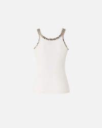 104109A35Y-Z04 Vest top in ribbed cotton-blend jersey. The front and back necklines and shoulder straps are covered with expertly hand-embroidered crystals and shiny studs that add shimmer and exquisiteness to the garment. Make any outfit extra elegant and feminine with this top, which is perfect to wear under a jacket, paired with either tailored trousers or even a pair of special jeans. COMPOSITION Outside Fabric: COTTON 65% POLYESTER 30% ELASTANE 5% - : Glass 100% - : STEEL 100% - : ACRYLIC 100% MEASURES W: 0.21 g