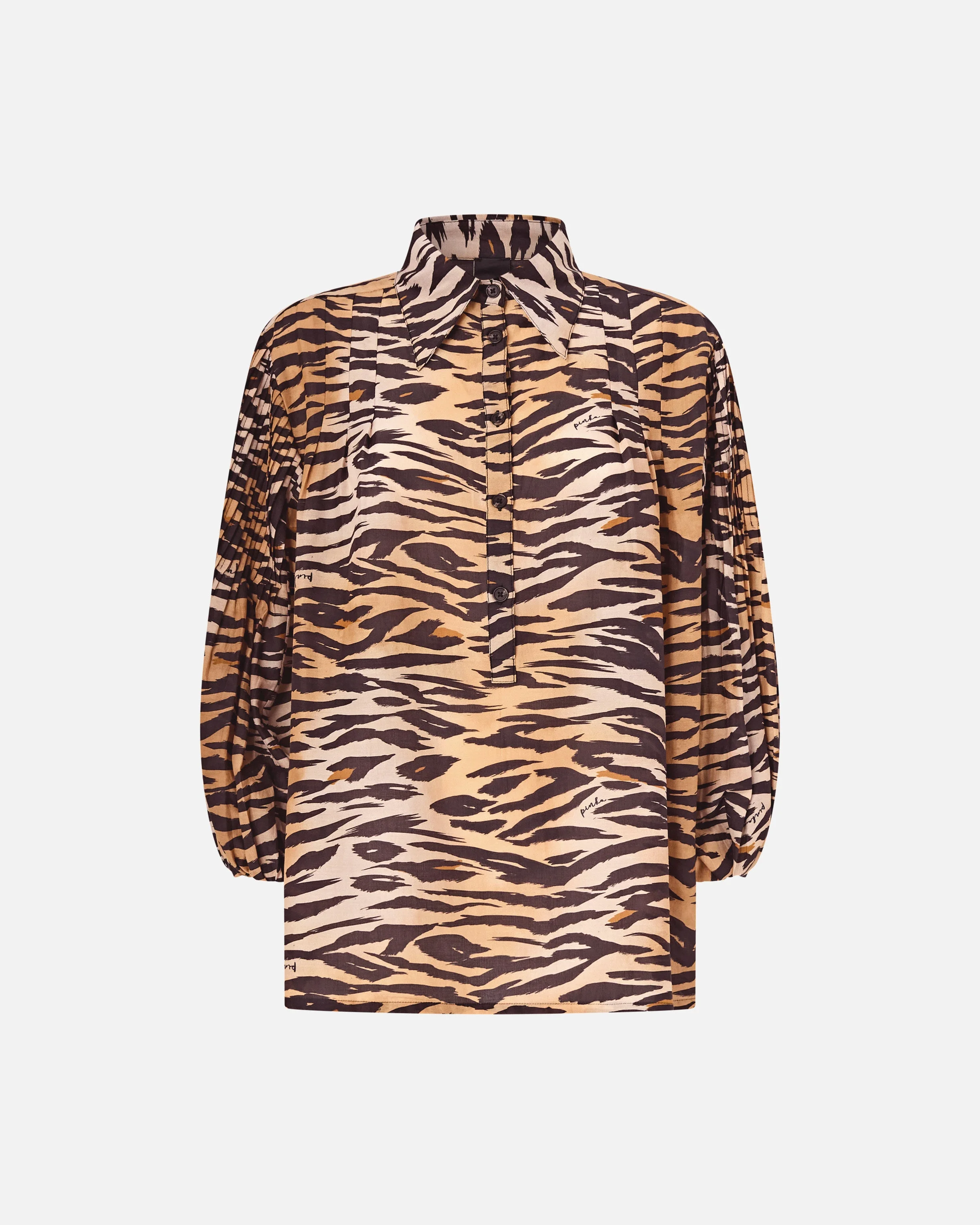106576A37Q-ZC8 Airy, relaxed-fit blouse made from radiant, lightweight cotton and silk fabric. Featuring a shirt collar and half-length button fastening at the front, this model stands out for its seductive tiger print and for the special detailing on the sleeves that, thanks to the small irregular pleats, creates volume at the top. The double-pleated rear yoke helps accentuate the fluid feel of the fabric, while the all-over pattern makes this garment the perfect choice to give your office looks a bold edge or lend your evening outfit a wild finishing touch. COMPOSITION Outside Fabric: COTTON 80% SILK 20% - Lining: COTTON 100%