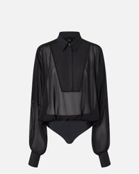 CRISTALBALL BODYSUIT − 105571A2VNZ99 Blouse-design bodysuit made from poly chiffon silk, a light and fluid fabric against the skin. The design focuses on the elegant play on contrasts provided by the soft, feminine lines of the body and sleeves, and by the masculine-inspired details of the shirt collar and the cotton poplin bib front, distinguished by a refined matte appearance. This style has not sacrificed some sparkle, thanks to the bejewelled buttons on the wrists and on the front, and is completed by a comfortable triple-clip bodysuit-style fastening. COMPOSITION 1° Outside Fabric: COTTON 100% - 2° Outside Fabric: POLYESTER 100% - 3° Outside Fabric: POLYAMMIDE 89% POLYAMIDE 89% ELASTANE 11%
