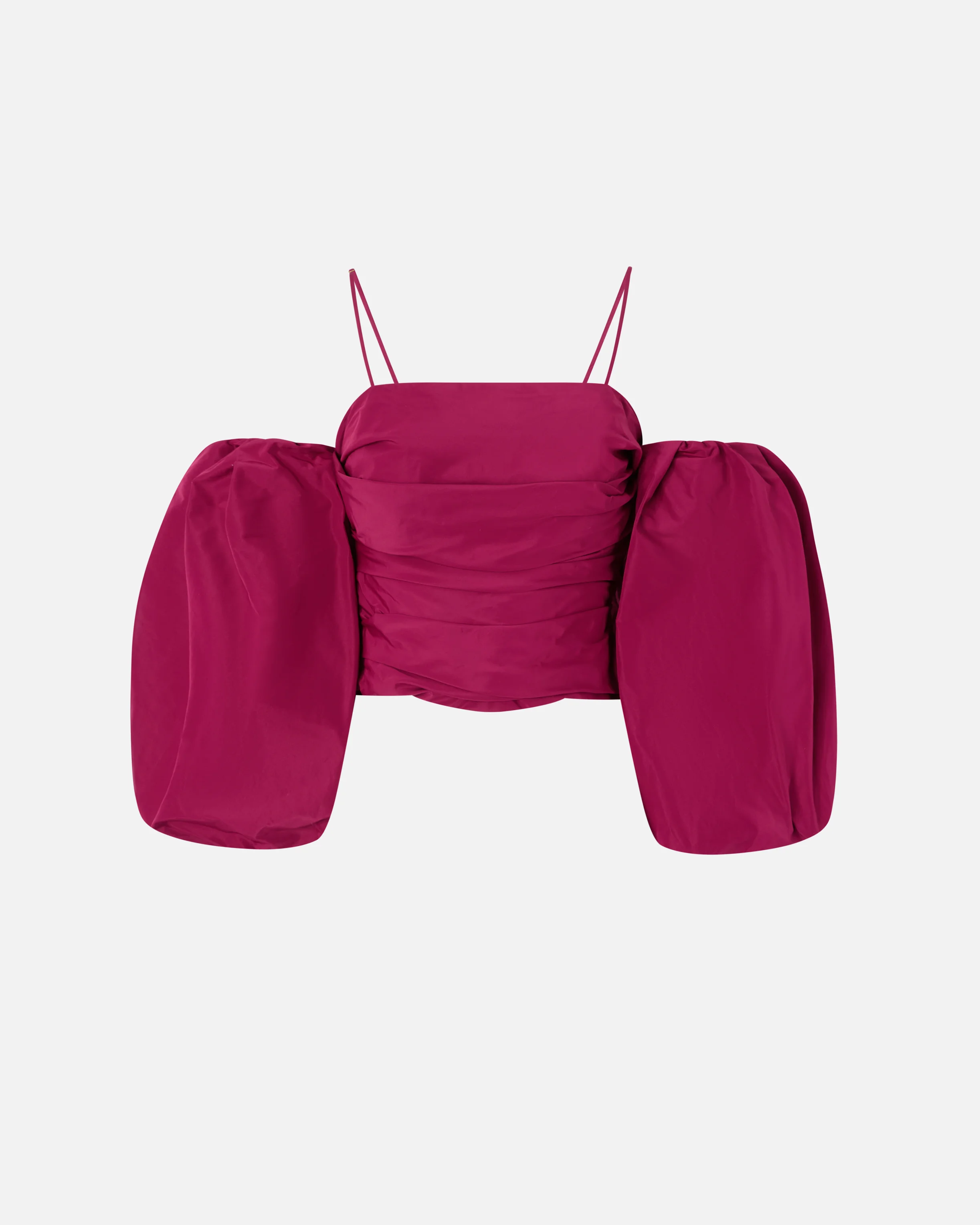 PALLOTTOLIERE TOP − 105552Y3LEWW4 Taffeta crop top with slim shoulder straps and detachable sleeves, offering different styling options. The material is light and shiny and blends perfectly with the dynamic-volume design that distinguishes the garment. The meticulous cuts and modern lines of the design are embellished by distinctive elements, such as the seductive bustier details on the back and the puff sleeves. It creates an outfit with a dramatic and striking effect, which is also accentuated by the slightly gathered fabric of this distinctive top. COMPOSITION Outside Fabric: POLYESTER 100% - Body lining: POLYESTER 90% ELASTANE 10% - Sleeve lining: POLYESTER 100%