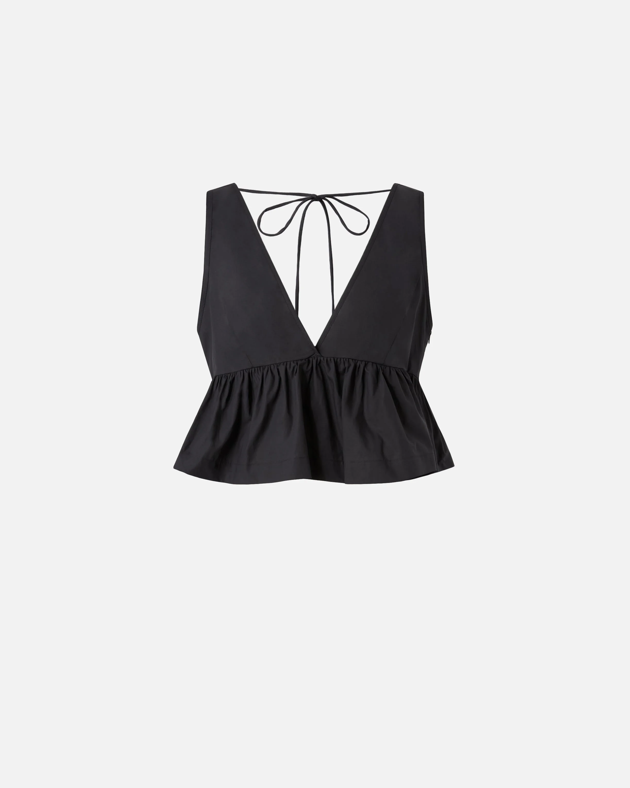 106451A2LD-Z99 Cropped sleeveless top in pure cotton poplin, featuring a soft flounce at the hem, a deep V-neck at the front and back, and thin ribbons to be tied behind the neck for customised styling. This model features an invisible side zip to help put it on. This garment, destined to become your all-purpose pair for various occasions, combines style and comfort. COMPOSITION Outside Fabric: COTTON 100%