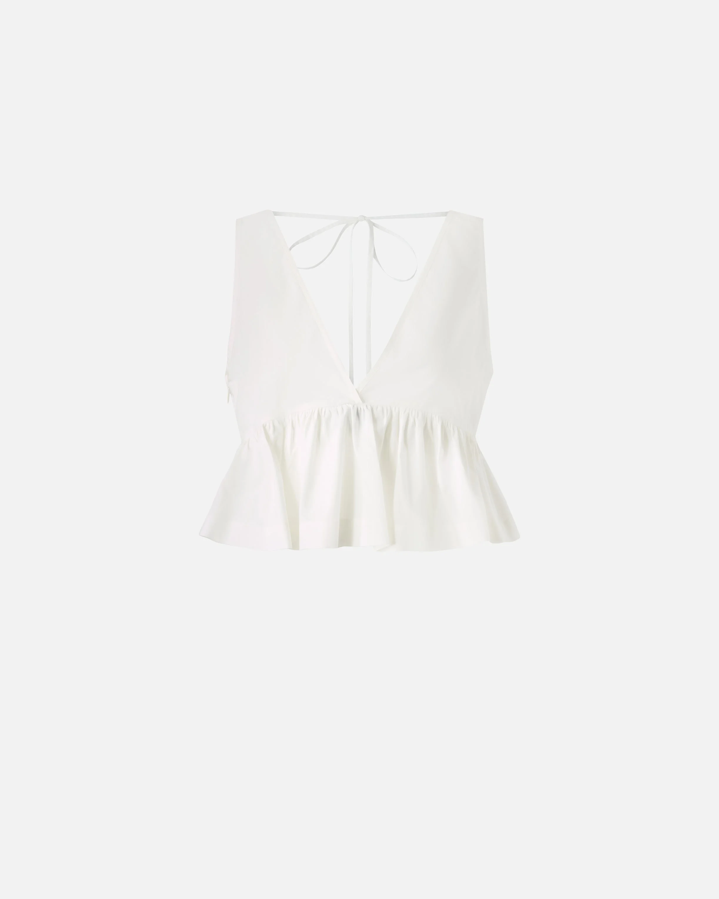 106451A2LD-Z05 Cropped sleeveless top in pure cotton poplin, featuring a soft flounce at the hem, a deep V-neck at the front and back, and thin ribbons to be tied behind the neck for customised styling. This model features an invisible side zip to help put it on. This garment, destined to become your all-purpose pair for various occasions, combines style and comfort. COMPOSITION Outside Fabric: COTTON 100%