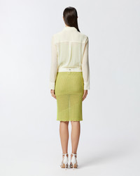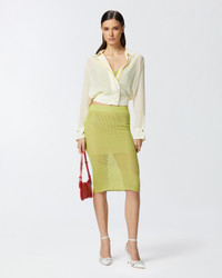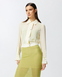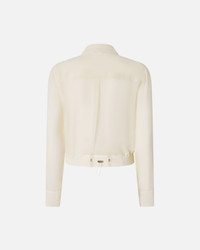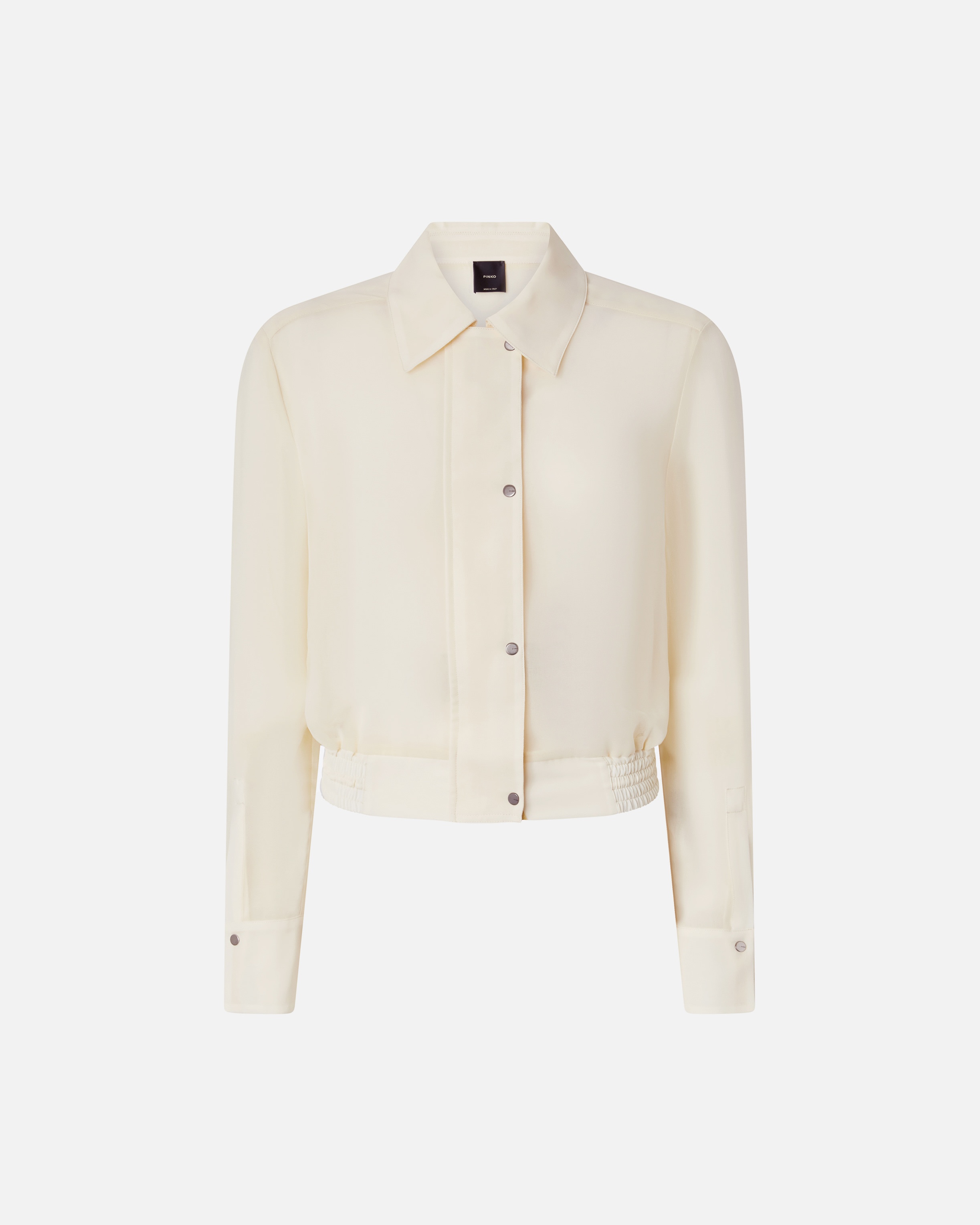 SHIRT CIN − 104787A21FD22 Women's shirt made of very light georgette and characterized by a particular silhouette reminiscent of bomber jackets: short cut, set-in sleeves with cuffs, elastic at the bottom of the garment and closure with flap and metal snap buttons. The adjustable drawstring detail inserted at the bottom of the garment, visible on the back, allows you to collect more volume, to customize the wear of the blouse. The garment reinterprets a wardrobe classic such as the women's shirt with originality and style, giving even more character to your spring looks. COMPOSITION Outside Fabric: POLYESTER 100%