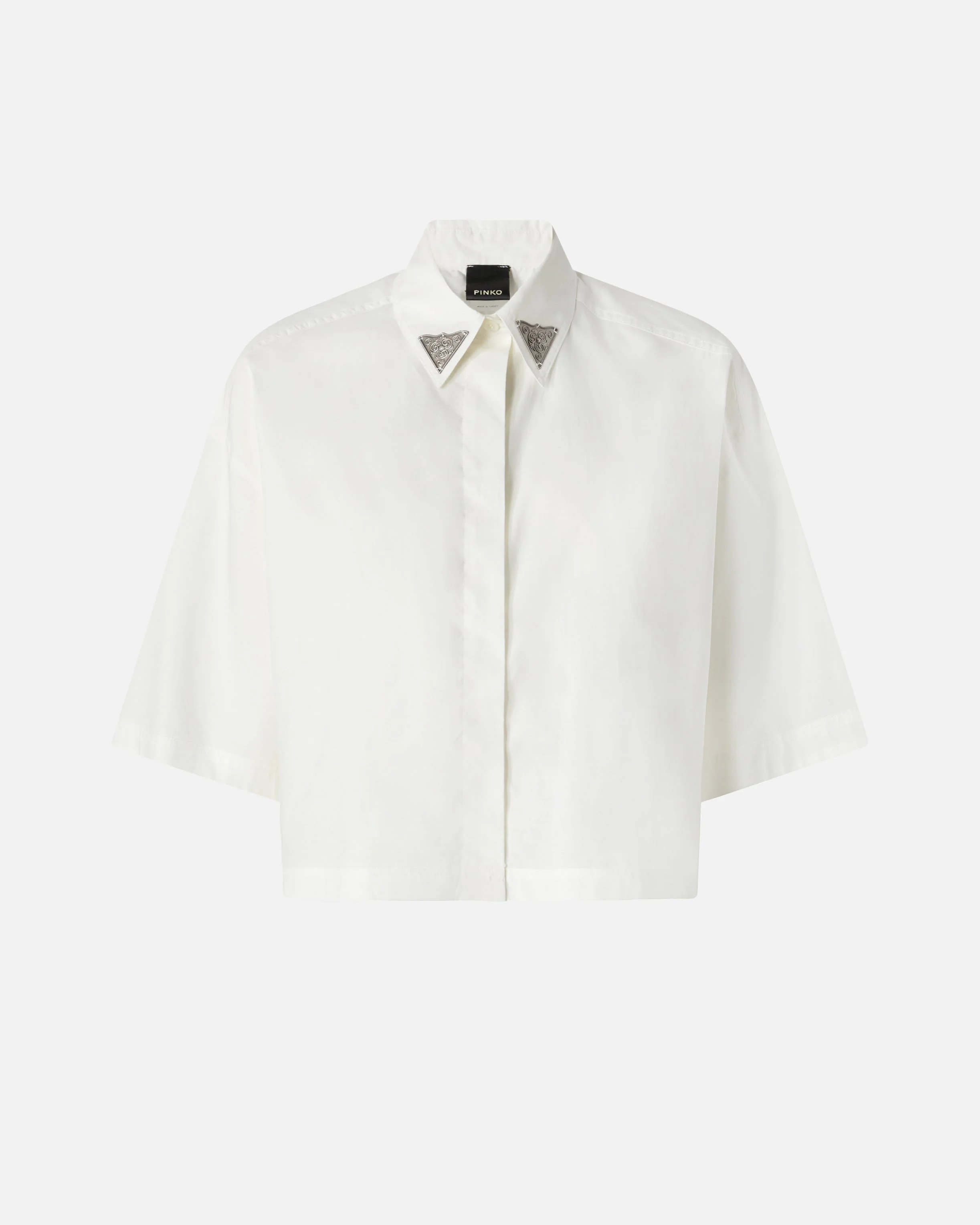 106826A2LD-Z05 Cropped shirt with wide short sleeves, made from pure cotton poplin with a fresh, pleasant feel. This model, perfect for giving daytime outfits an original finishing touch or creating fresh, relaxed evening looks, is enhanced by carefully work details that reflect PINKO's character as a brand, including two finely decorated metal appliques on the collar tips and embroidered PINKO logo lettering. COMPOSITION Outside Fabric: COTTON 100% - Lining: COTTON 100% - : Brass 100% brass 100%