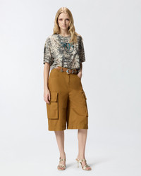 106921A3C8-CZ9 Cropped pure cotton T-shirt with eye-catching all-over snake print and iconic Love Birds logo formed by micro studs, rhinestones and crystals that create an exquisite two-tone effect. An edgy, modern garment, this one will win over animal-print lovers and more the moment they see it. COMPOSITION 1° Outside Fabric: COTTON 100% - 2° Outside Fabric: COTTON 95% ELASTANE 5% - : Zinc 100% - : ACRYLIC 100% - : Glass 100% - : STEEL 100% MEASURES W: 0.23 g