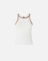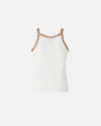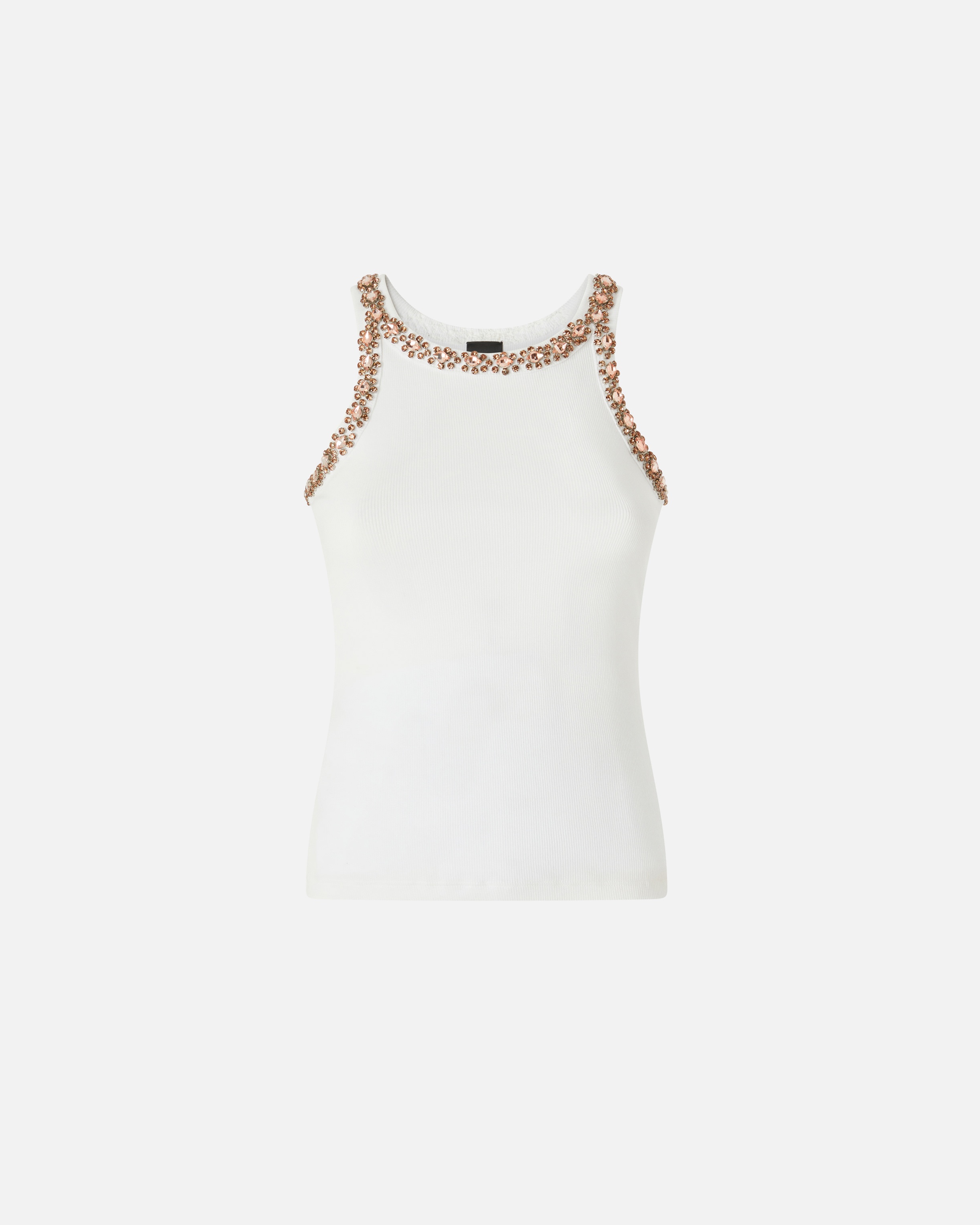 CORIANDOLI VEST TOP − 104109A246Z04 Slim-fitting, sleeveless vest top in ribbed stretch cotton fabric. The shiny, floral-effect rhinestone and chaton embroidery enhancing the neckline and thin shoulder straps at the front and back is hand-worked. Customised with embroidered PINKO logo in the middle at the back. COMPOSITION Outside Fabric: COTTON 91% ELASTANE 9% - : Glass 100% - : copper 100% COPPER 100%