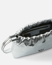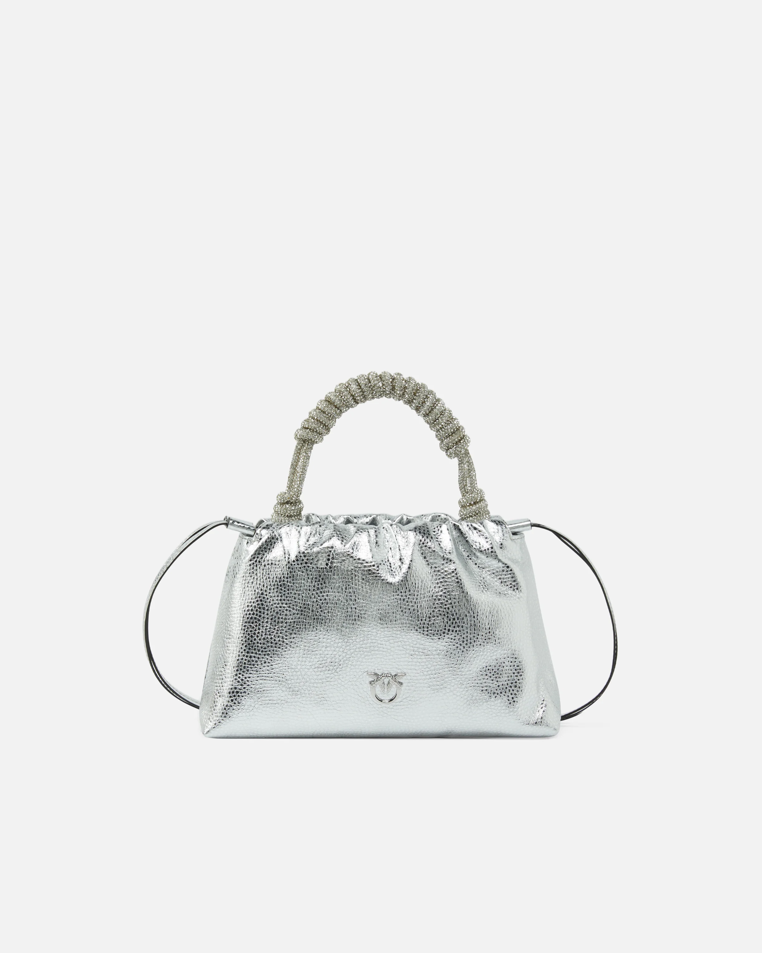 MINI CLUTCH+HANDLE SP − 105908A2WDZZFN00001 Mini clutch bag made of tumbled leather with a laminated finish and a slight raised grain, which enhances the brightness of the material and gives character to the surface. The soft pouch design is completed by a drawstring closure with a top ruffle and a short handle entirely covered with decorative cords intertwined with micro crystals. The double thin shoulder strap, removable and adjustable, allows it to be worn on the shoulder or crossbody. Internally it is lined with technical fabric with a zip pocket and card slots for perfect space organization. The tone-on-tone metal Love Birds logo applied to the front signs the accessory with an iconic and discreet sign. Perfect for those looking for a compact but impactful bag, to be carried from day to night with essential looks or contrasting textures. COMPOSITION Leather: CALF LEATHER 100% CALFSKIN LEATHER 100% - Outside Fabric: Silica 100% SILICON DIOXIDE 100% - Internal: COTTON 100% - Accessory: Zinc 100% MEASUREMENTS - Height: 18 cm - Width: 7 cm - Length: 26 cm