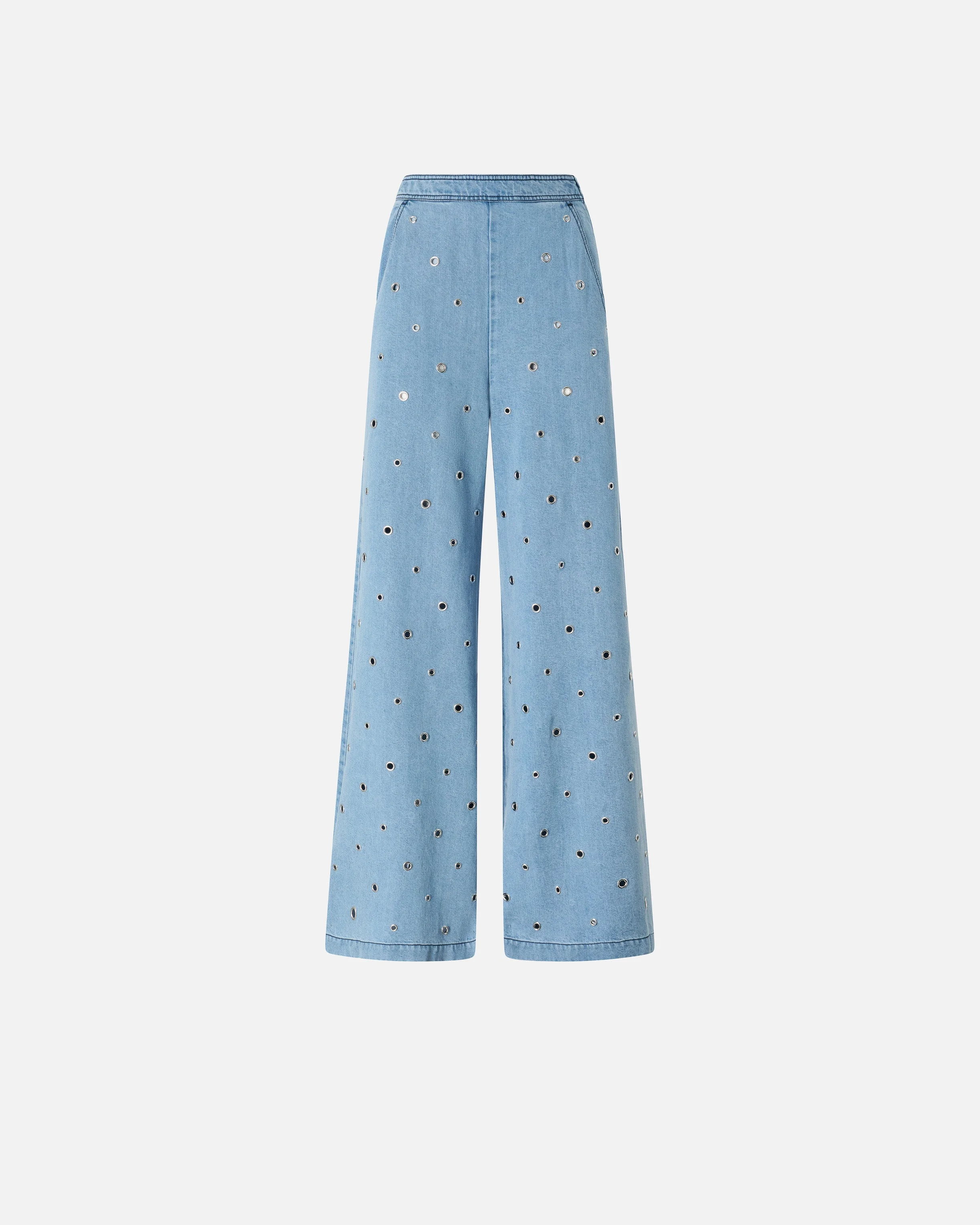 106636A33C-PJE Flared trousers with slanted side pockets and side zip fastening. This piece stands out for its distinct workmanship: the lightweight, fluid pure lyocell denim features a skilfully faded finish and is doted all over with small metal eyelets for a subtle openwork effect. Transform your daytime look into an original fashion statement by pairing these jeans with the matching blouse. COMPOSITION Outside Fabric: LYOCELL 100% - Lining: COTTON 100% - : copper 100% COPPER 100% MEASURES W: 0.8 g