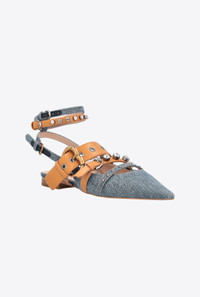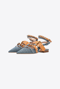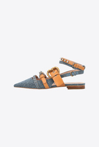 Flat denim slingbacks with rhinestones on both the denim and leather straps. Pointed toe and small metal buckle-fastened straps on the front and heel. Sole made from tunit, a synthetic material with properties similar to leather, 1.5 cm flat heel, and leather lining and insole. COMPOSITION Upper: COTTON 75% POLYURETHANE 25% - Sole: GOATSKIN 100% - Sole: ELASTODIENE 100% RUBBER 100% - Lining: GOATSKIN 100% MEASUREMENTS - Heel height: 1.5 cm