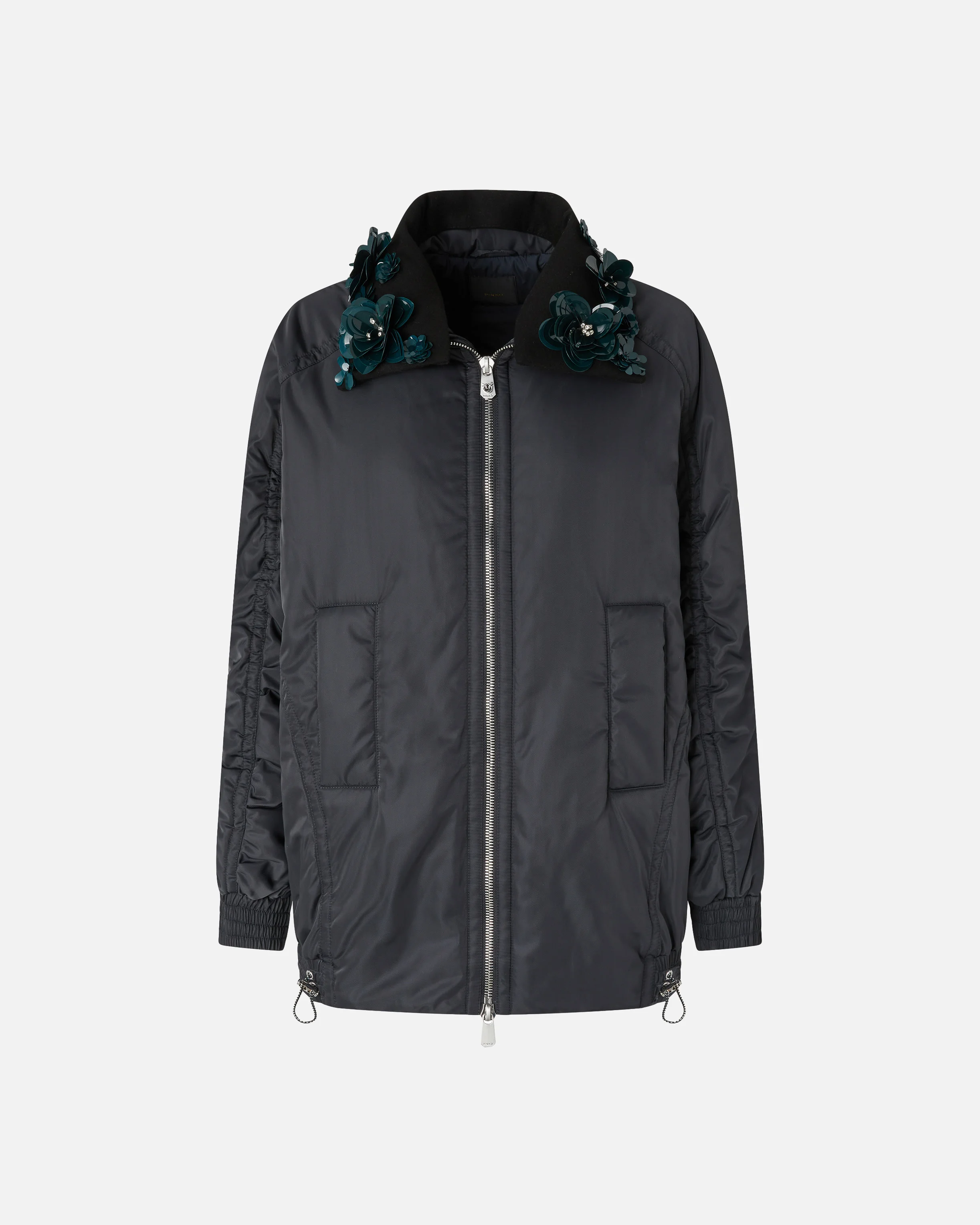 CLARINDA BLOUSON − 105942A2Y0G05 Blouson in water-repellent matte diagonal nylon with light padding, relaxed cut and raglan sleeves that ensure full freedom of movement; the cloth collar is embellished with handmade 3D maxi flowers that decorate the opening with a couture touch, while the front closure features a shiny double slider zip; two front flap pockets, elasticized cuffs and bottom with adjustable drawstring and stopper guarantee protection from the wind; internal lining customized with a small Love Birds logo and diagonal topstitching on the sleeves complete the finishes; perfect for giving character to a simple total denim in the city. COMPOSITION 1° Outside Fabric: POLYESTER 100% - 2° Outside Fabric: POLYESTER 93% VISCOSE 5% ELASTANE 2% - Lining: POLYESTER 100% - Padding: POLYESTER 100% - Accessory: POLYESTER 100% - : ACRYLIC RESIN 100% ACRYL.RES. 100% - : Glass 100% - : copper 100% COPPER 100%