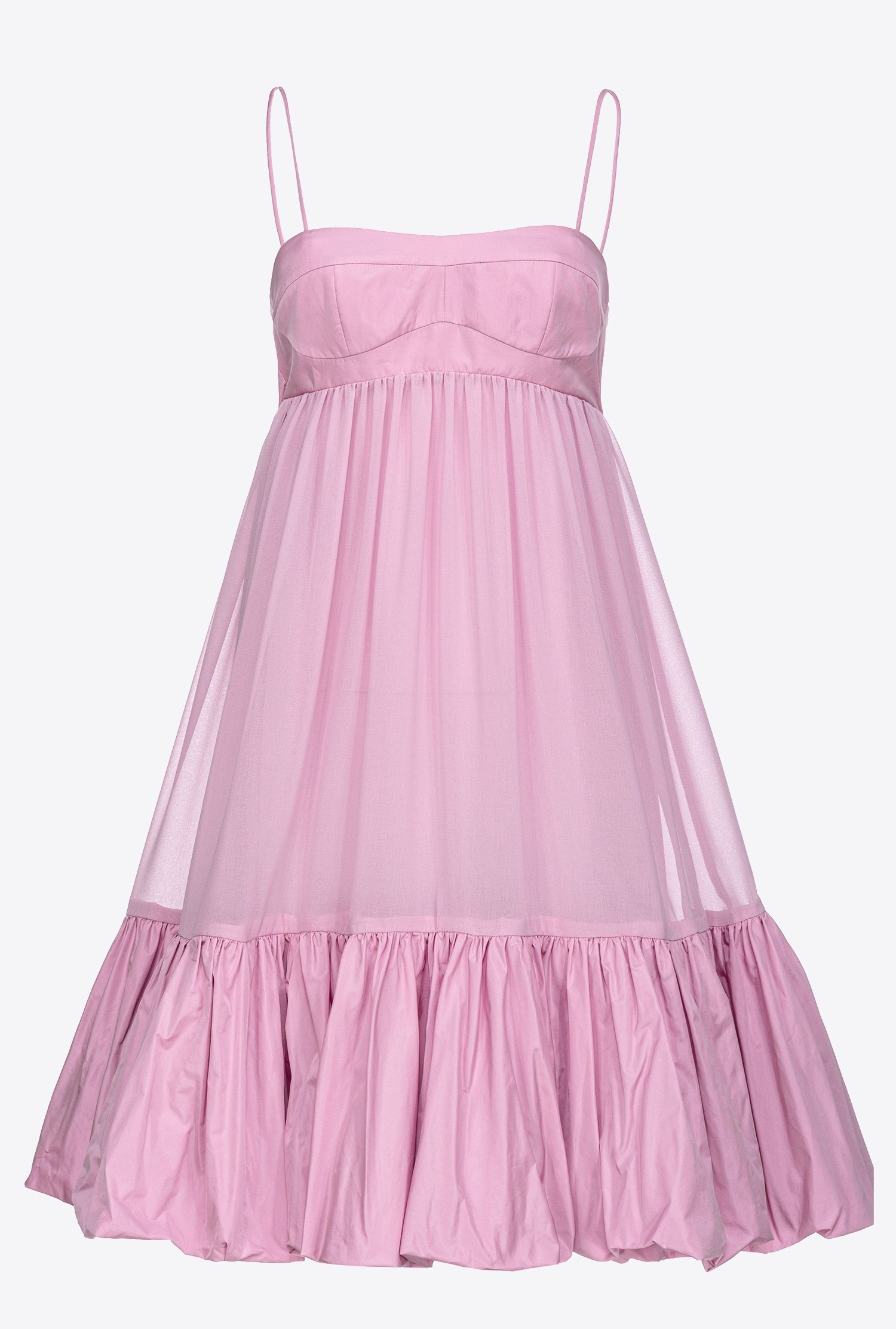 Short, sleeveless georgette dress with insert on the neck and taffeta flounces at the bottom. Removable thin shoulder straps, sweetheart neckline with cups, empire waist seam and flared hem. Invisible zip fastening at the top in the middle on the back. COMPOSITION 1° Outside Fabric: POLYESTER 100% - 2° Outside Fabric: POLYESTER 100% - Lining: POLYESTER 100%