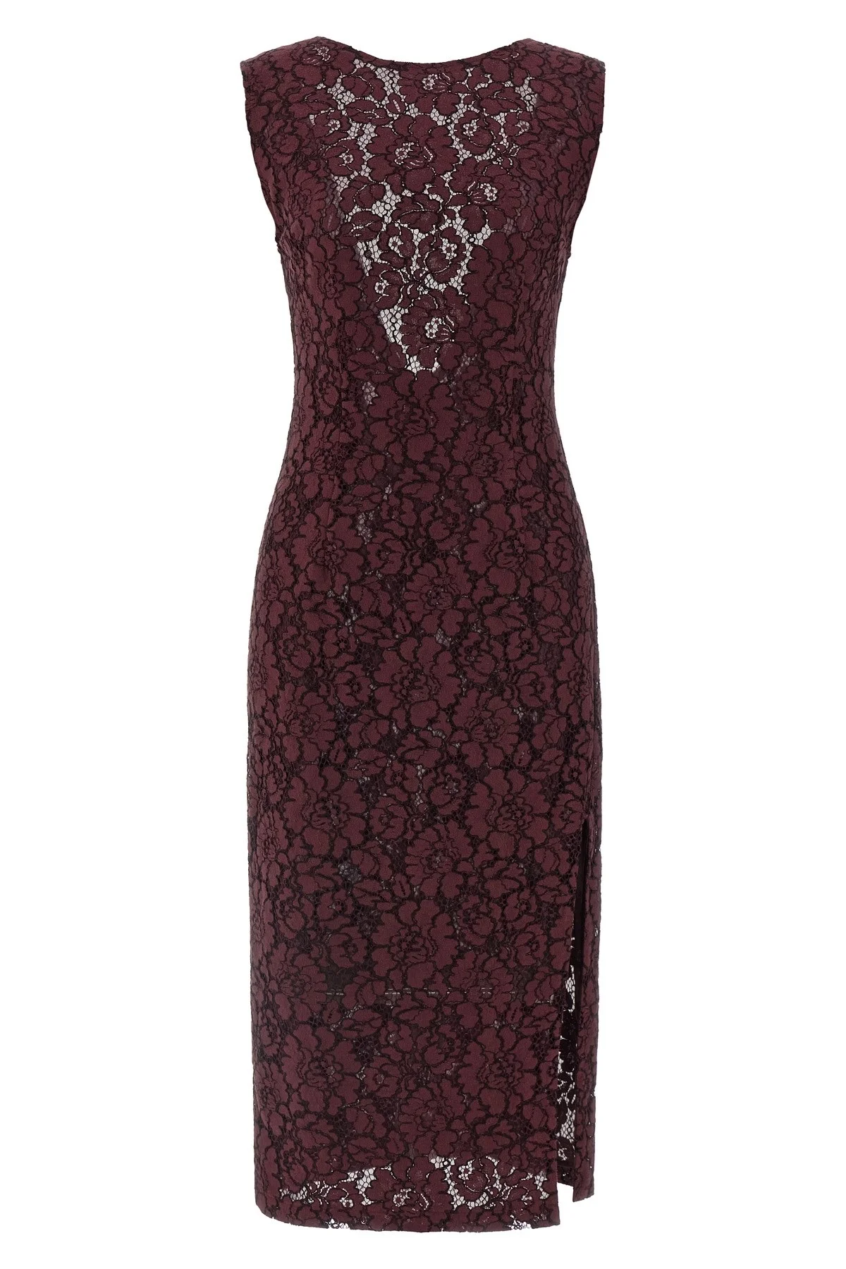 cod. 106588A330R57 Drupa' lace midi dress doubled with a tone-on-tone semi-transparent layer, sleeveless sheath dress with boat neckline, deep back neckline, back closure with hidden zip, side split. Color: Bordeaux Size & Fit: True to size fit Composition: 64% cotton 21% polyamide 15% viscose Made in: Albania