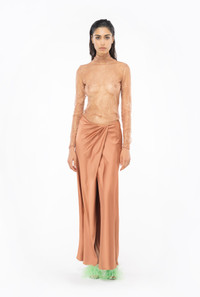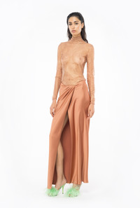 Long, flowing skirt made from glossy hammered satin fabric with an elegant, slightly wavy texture. Wraparound silhouette that creates a deep slit at the front. Concealed central zip fastening on the back. COMPOSITION Outside Fabric: POLYESTER 100%