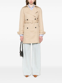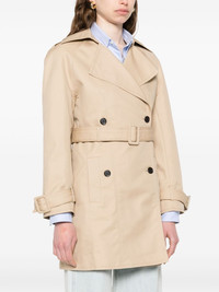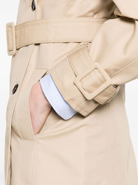 double-breasted trench coat Highlights - Light beige - Double-breasted button fastening - Detachable waist belt - Two side slit pockets - Belted cuffs Imported Composition Outer: Cotton 56%, Polyester 44% Lining: Polyester 100% SIZE & FIT Model measurements Height 5 ft 10 in(1.79 m) Bust/Chest 35.43 in(90 cm) Hips 35.03 in(89 cm) Waist 25.19 in(64 cm) FittingInformation Designed for a slim fit that sits just away from the body offering a close yet comfortable fit The belt offers adjustability for fitted preferences Made from a midweight non-stretch fabric Washing instructions Machine Wash