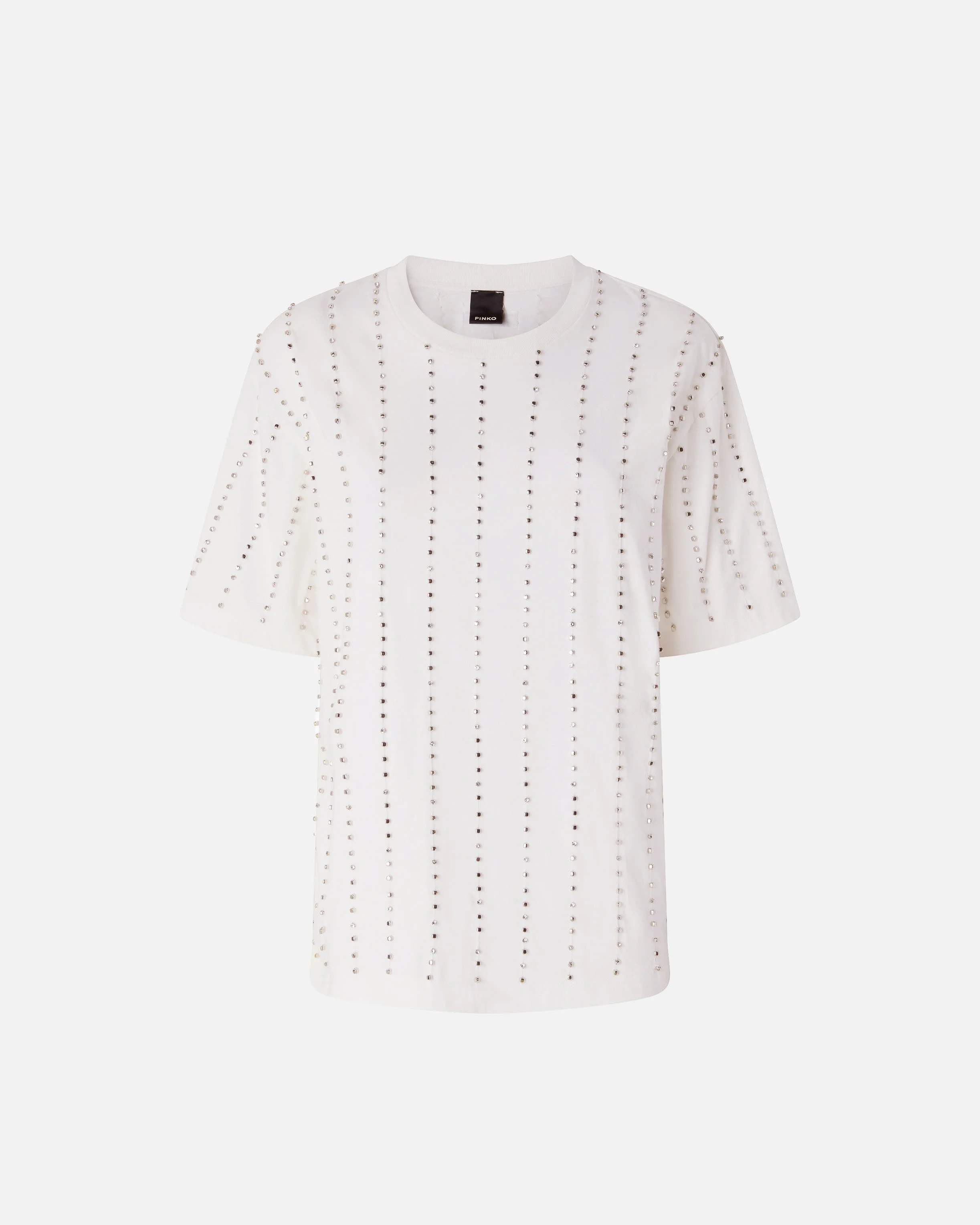 106213A31E-Z07 Cotton jersey crew-neck T-shirt with half sleeves. Thanks to the striking, pinstripe-inspired motif formed by alternating small cube-shaped metallic elements and hand-embroidered set crystals, this piece is a real gem—literally. The final touch is given by the label with PINKO logo lettering on the back. Thanks to its versatile yet elegant design, it's perfect to wear under a jacket and with tailored trousers, or with a pair of special jeans. COMPOSITION 1° Outside Fabric: COTTON 100% - 2° Outside Fabric: COTTON 95% ELASTANE 5% - : Glass 100% - : Brass 100% brass 100% - : POLYESTER 100% MEASURES W: 0.34 g