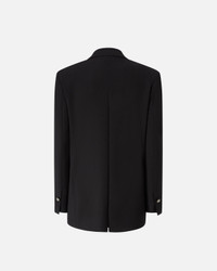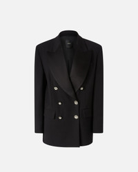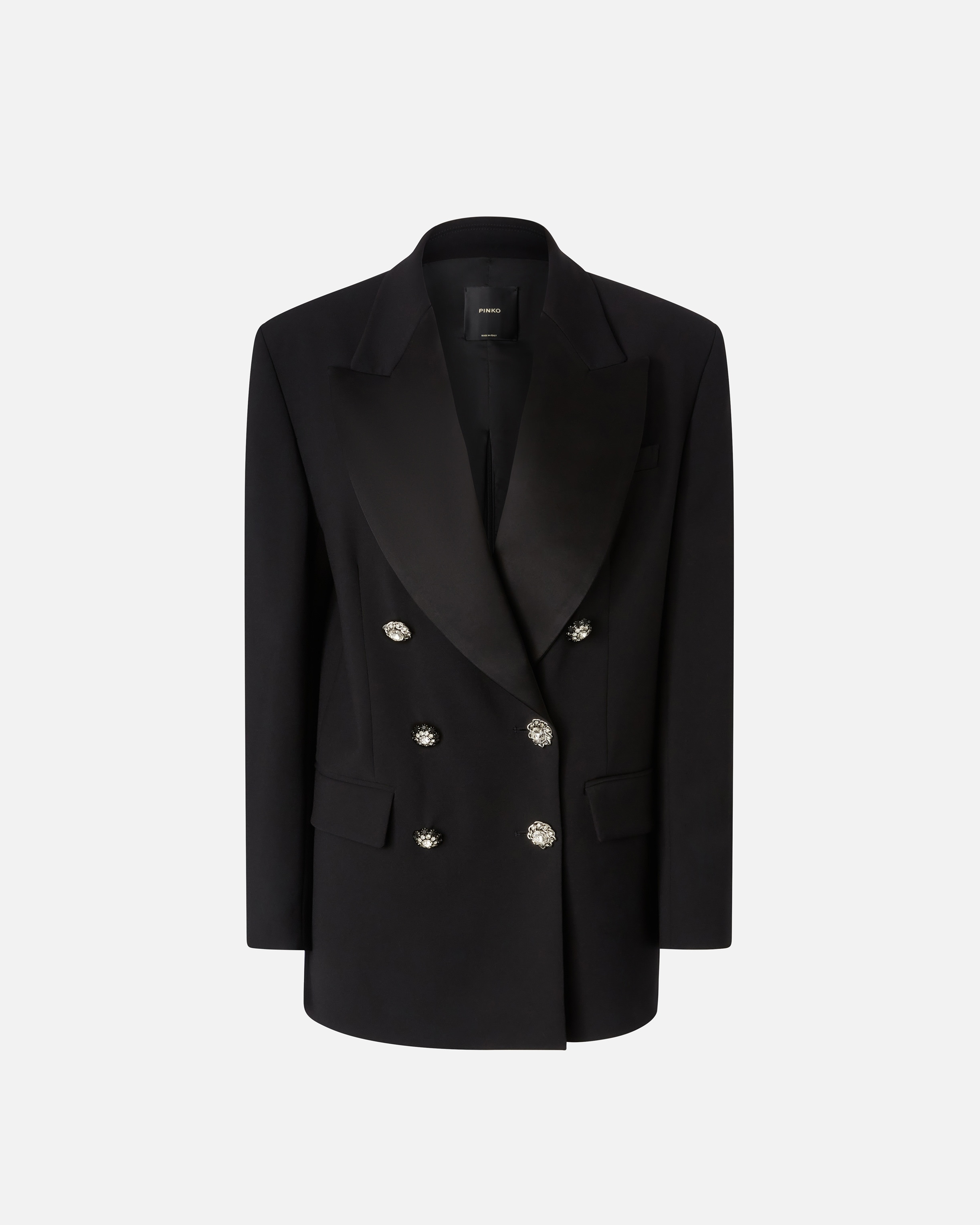 VALLINI JACKET − 1044967873Z99 Women’s elegant double-breasted blazer made of a double fabric diagonal stretch viscose featuring a wide lapel collar in contrasting shiny fabric for an even more refined style. The jacket has long sleeves with structured shoulders, flap pockets at the hips and a welt breast pocket at the front. The centre slit at the back of the garment hem can be closed with an invisible zip, which also allows the depth of the slit to be customised. The most attractive features of this double-breasted blazer are the jewel buttons that customise the fastening, along with the rhinestone chain pin. COMPOSITION 1° Outside Fabric: VISCOSE 63% POLYAMIDE 29% POLYAMMIDE 29% ELASTANE 8% - 2° Outside Fabric: ACETATE 91% POLYESTER 9% - Lining: ACETATE 67% POLYESTER 33%