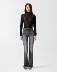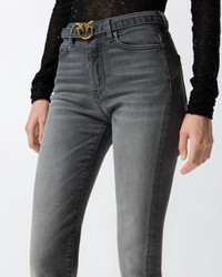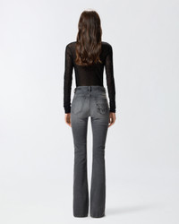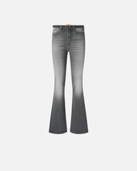 FLORA FLARE − 100166A2S2PJ9 Flared five-pocket jeans with a fitted leg to the knee that flares on the hem, in dark grey power stretch denim made from partially recycled cotton with fading. The fabric used is a high recovery denim that does not lose its shape easily and thus will retain its original shape over time. The lettering logo embroidered on the back of the waistband and the Love Birds logo, in the form of embroidery on the right back pocket and a rivet on the coin pocket, add pure PINKO style to the design. Complete with a matching-fabric belt with the metal Love Birds Diamond Cut buckle. Mid-rise with belt loops and a zip and button fastening. COMPOSITION Outside Fabric: COTTON 82% POLYESTER 16% ELASTANE 2% - Lining: POLYESTER 65% COTTON 35%