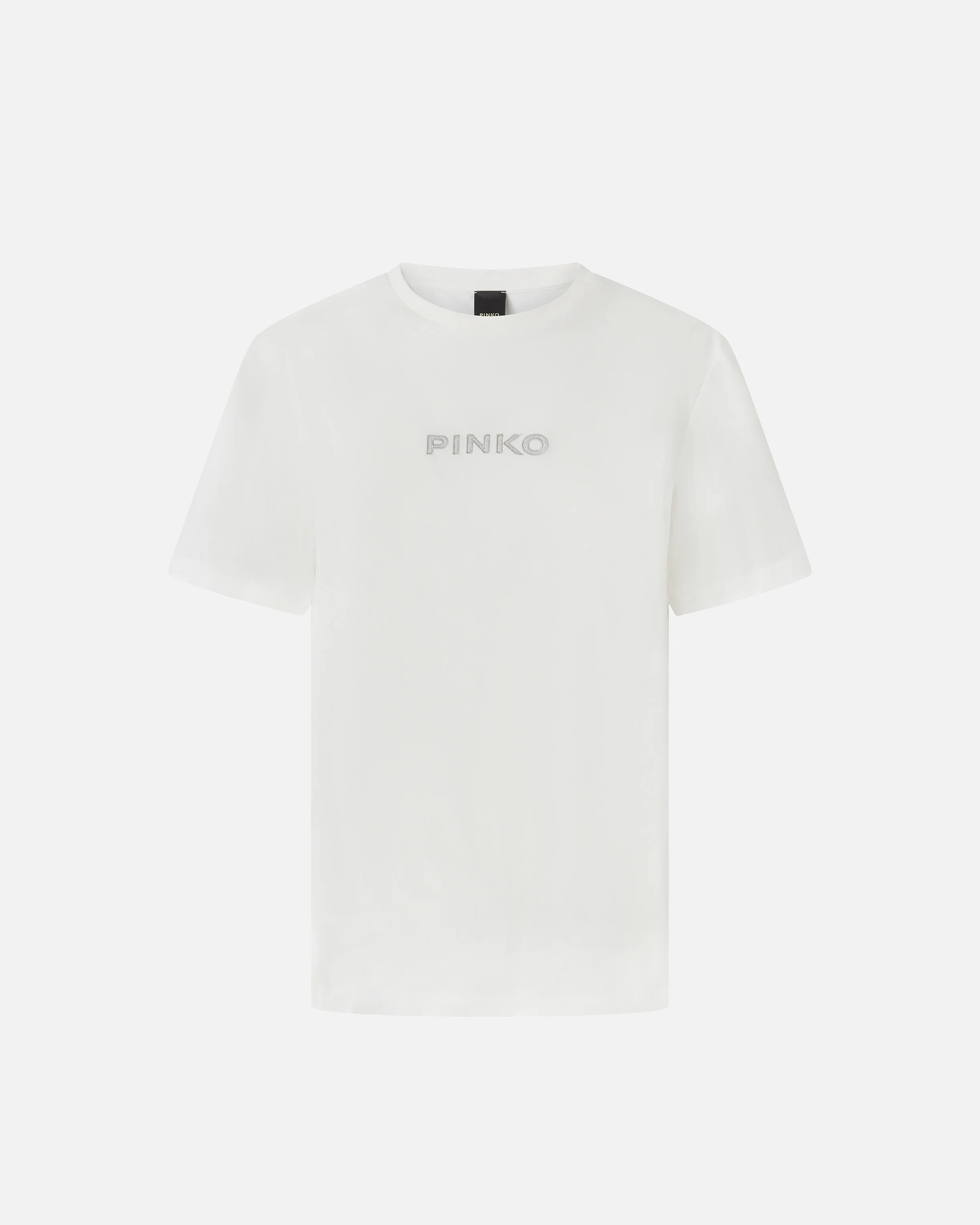 STREPITOSO T-SHIRT − 105526A2S1Z05 Pure cotton jersey T-shirt with round neck and short sleeves. The piece features shiny rhinestones that cover both the PINKO lettering logo on the front and the lettering on the back with the slogan "Sail the blue PINKO IS WITH YOU" and our must-have Love Birds logo. This T-shirt will work seamlessly with your favourite trousers, elevating your look in a simple, elegant and original way. COMPOSITION 1° Outside Fabric: COTTON 100% - 2° Outside Fabric: COTTON 95% ELASTANE 5% - : aluminium 100% Aluminium 100%