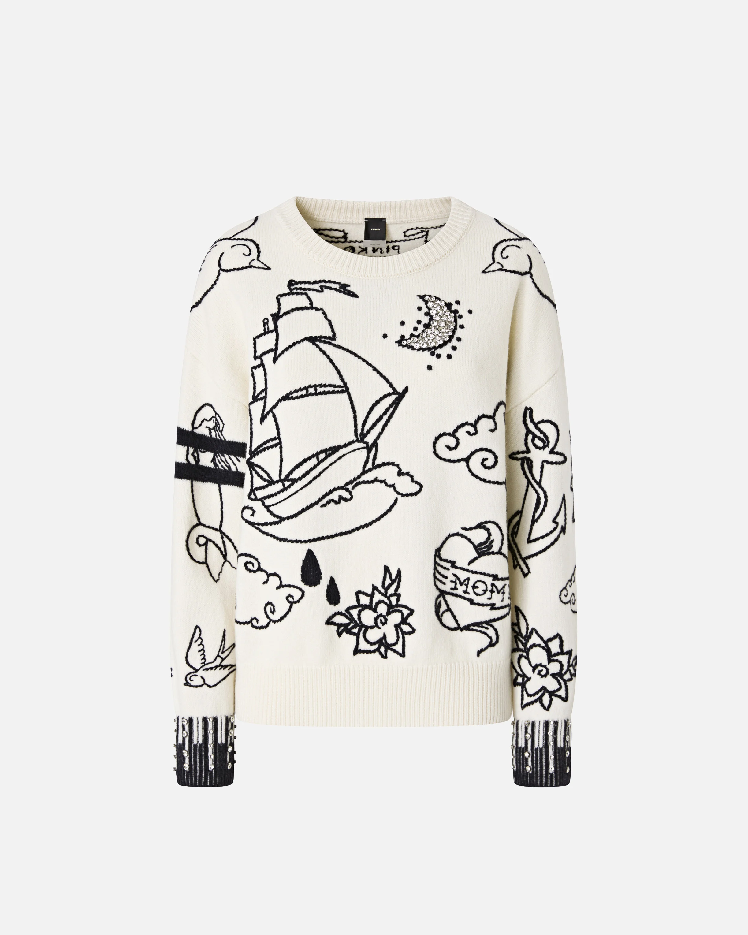 ANDROS KNITWEAR − 105427A2PKZE1 Long-sleeved crew-neck sweater in merino wool: a soft and lightweight yarn for an original wardrobe. Show off a new look with this design that is lush with embroidered patterns and rhinestone details on the cuffs. The crew-neck, hem and cuffs are ribbed, while the final touch is given by the PINKO lettering logo on the back of the design. The piece has undergone finishing tests to minimise the possible formation of pilling, ensuring greater fabric softness and durability. COMPOSITION Outer Yarn: WOOL 100% - : POLYESTER 54% POLYAMMIDE 20% POLYAMIDE 20% ACRYLIC 20% WOOL 6% - : Glass 100% - : STEEL 100%
