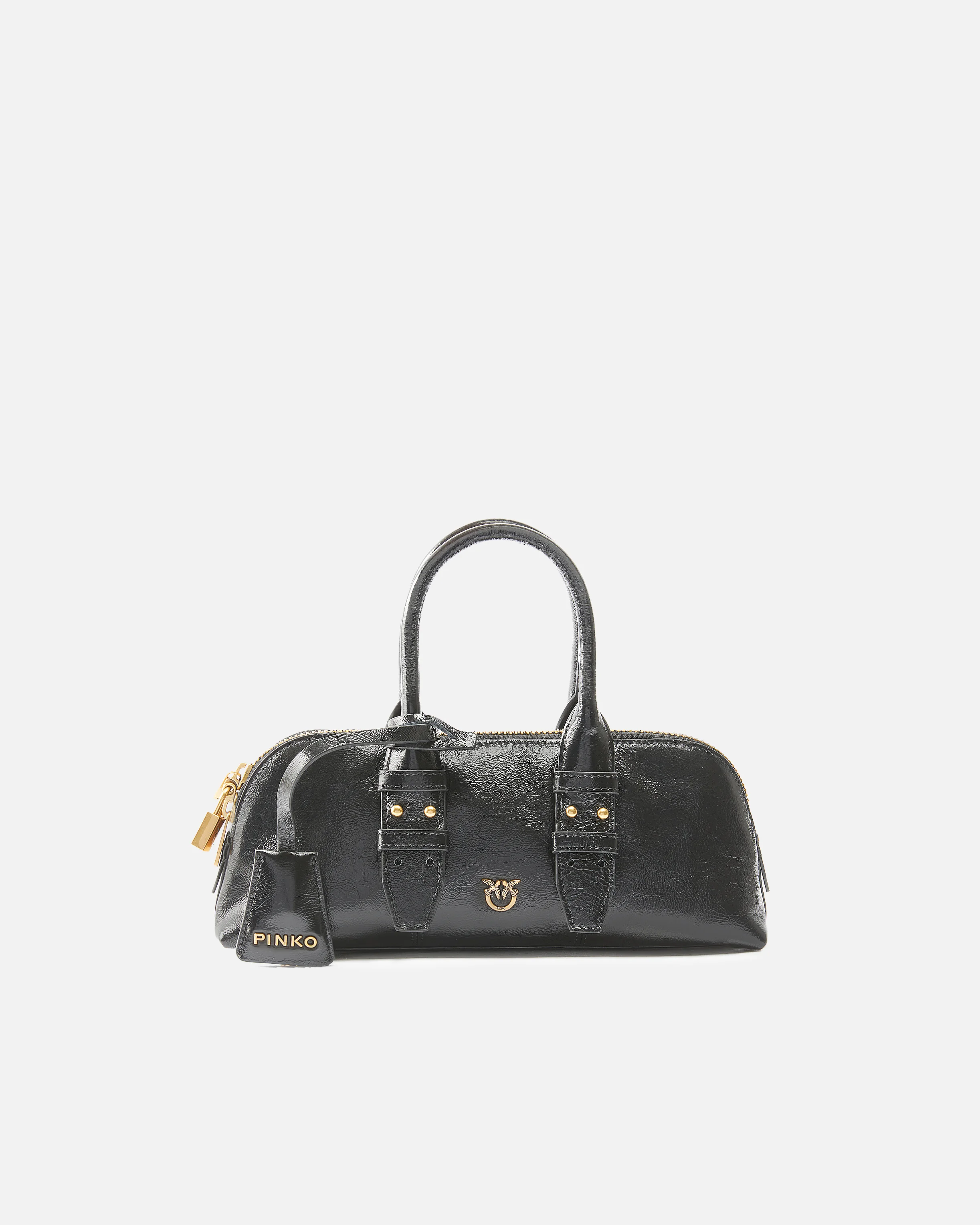 BOWLING BAG BAGUETTE − 105334A2VWZ99Q00001 Escape Bag Baguette small handbag with elongated rectangular shape, made entirely from patent-effect leather. Featuring an adjustable and detachable leather shoulder strap and double handle so it can be carried by hand or on the shoulder, the bag is very versatile and practical. The model features a functional padlock that opens and closes with a key contained in the matching charm, while the finishing touch is provided by the small Love Birds logo plaque symbolising the brand's singular style. The zip fastening at the top opens to reveal a cotton-lined interior with multiple slip pockets. Activate your PINKO bag: verify the authenticity of your product and access a personalised experience by scanning the Love Birds embroidery on the back of the bag with your smartphone! COMPOSITION Leather: COWHIDE 100% BOVINE SKIN 100% - Secondary Lining: COTTON 100% - : POLYAMMIDE 50% POLYAMIDE 50% POLYURETHANE 50% MEASUREMENTS - Height: 22 cm - Width: 8 cm - Length: 29 cm