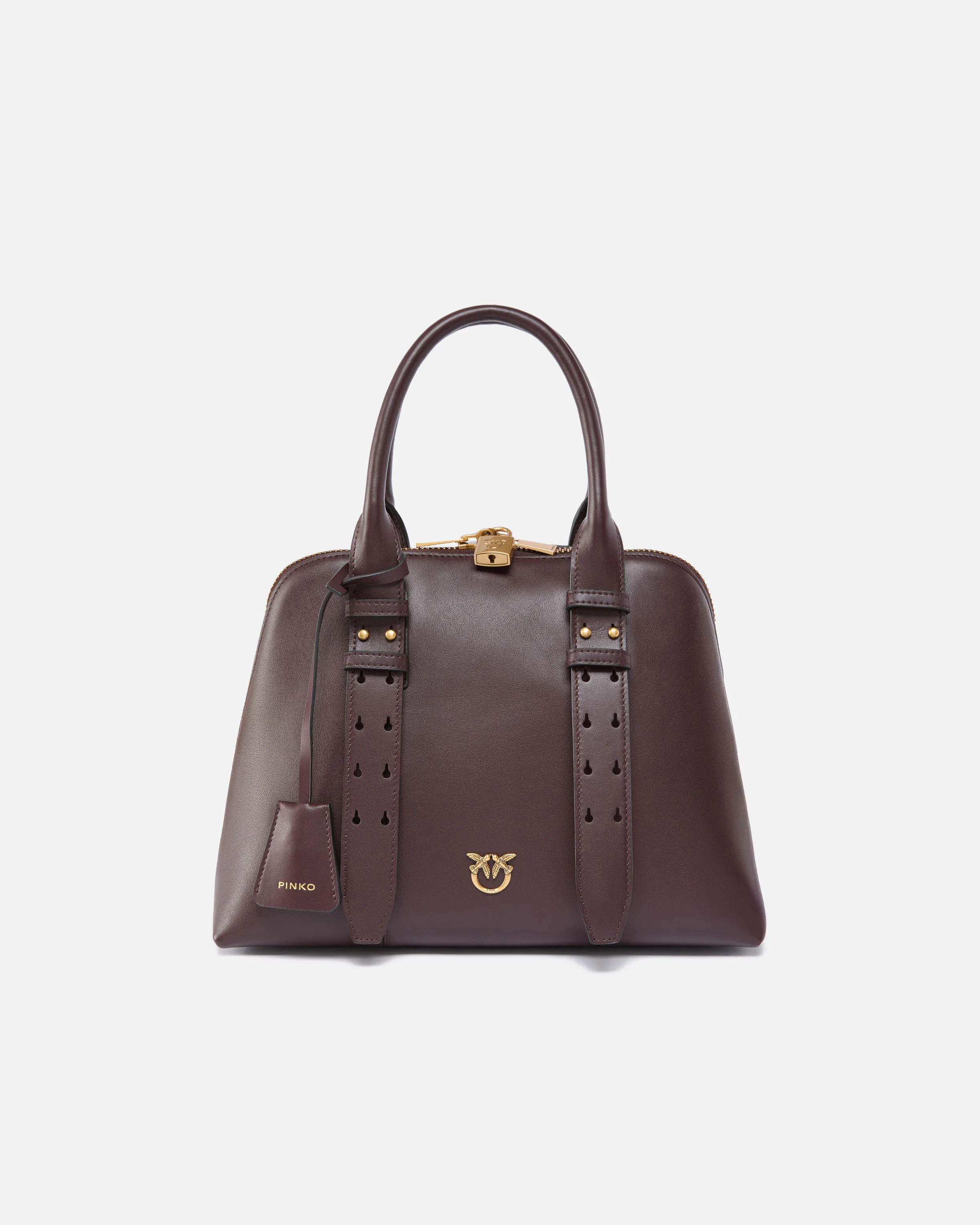 BOWLING BAG MEDIUM − 105906A0QOLA7Q00001 Escape Bag medium bowling handbag made entirely from soft leather. Featuring an adjustable and detachable leather shoulder strap and double handle so it can be carried by hand or on the shoulder, the bag is very versatile and practical. The model features a functional padlock that opens and closes with a key contained in the matching charm, while the finishing touch is provided by the small Love Birds logo plaque symbolising the brand's singular style. The zip fastening at the top opens to reveal a cotton-lined interior with a single zipped slip pocket. Activate your PINKO bag: verify the authenticity of your product and access a personalised experience by scanning the Love Birds embroidery on the back of the bag with your smartphone! COMPOSITION Leather: COWHIDE 100% BOVINE SKIN 100% - Outside Fabric: POLYURETHANE 100% - Lining: COTTON 100% MEASUREMENTS - Height: 23 cm - Width: 13 cm - Length: 30 cm