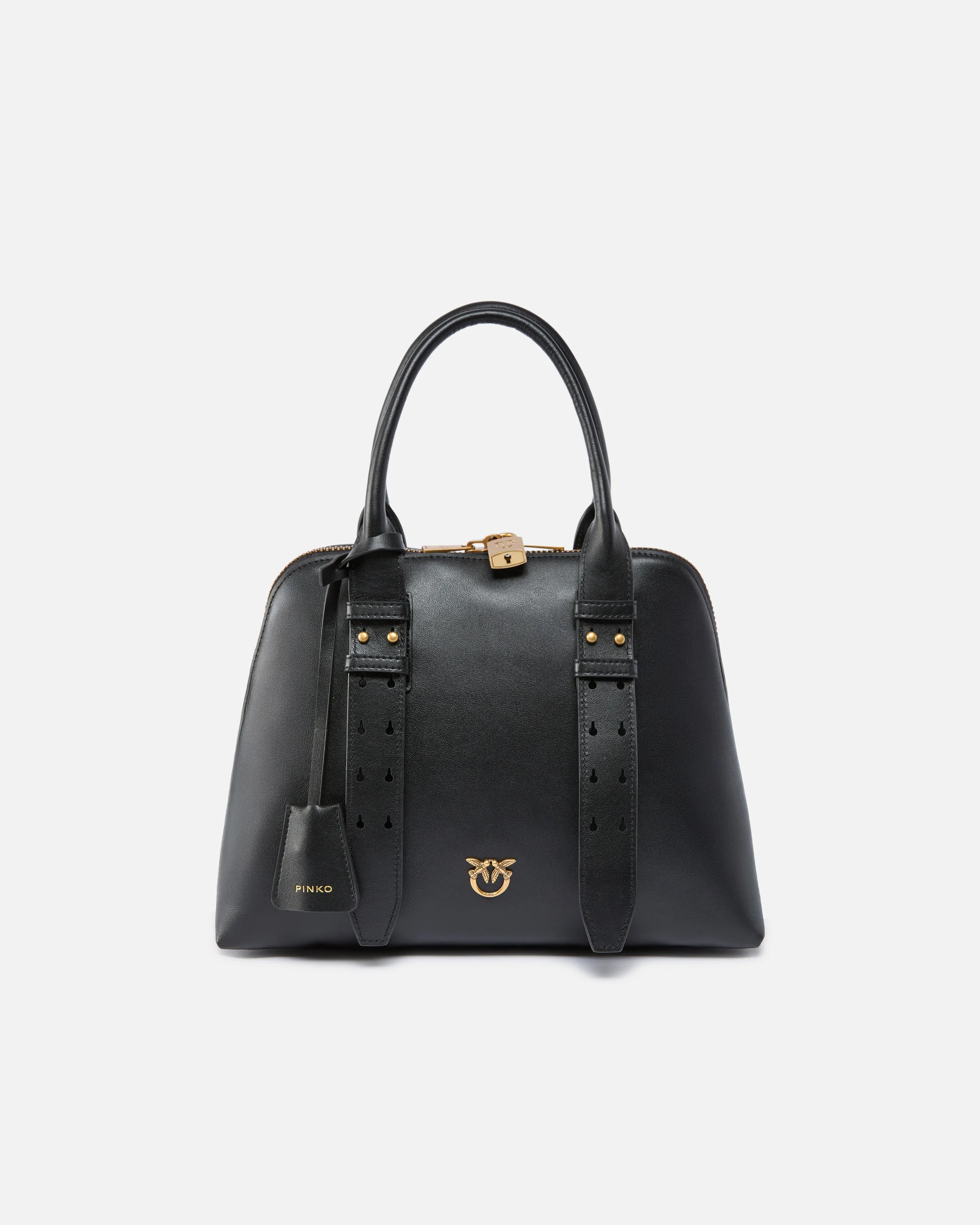 BOWLING BAG MEDIUM − 105906A0QOZ99Q00001 Escape Bag medium bowling handbag made entirely from soft leather. Featuring an adjustable and detachable leather shoulder strap and double handle so it can be carried by hand or on the shoulder, the bag is very versatile and practical. The model features a functional padlock that opens and closes with a key contained in the matching charm, while the finishing touch is provided by the small Love Birds logo plaque symbolising the brand's singular style. The zip fastening at the top opens to reveal a cotton-lined interior with a single zipped slip pocket. Activate your PINKO bag: verify the authenticity of your product and access a personalised experience by scanning the Love Birds embroidery on the back of the bag with your smartphone! COMPOSITION Leather: COWHIDE 100% BOVINE SKIN 100% - Outside Fabric: POLYURETHANE 100% - Lining: COTTON 100% MEASUREMENTS - Height: 23 cm - Width: 13 cm - Length: 30 cm