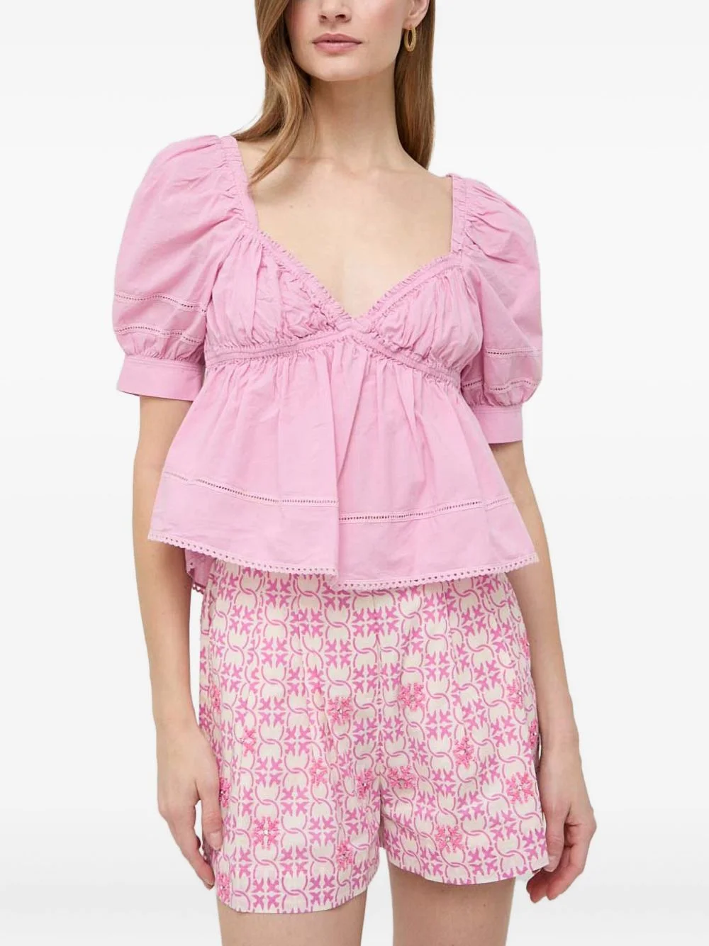 eyelet puff-sleeve top Highlights - Pink - Eyelet detailing - Puff sleeves - V-neck - Gathered waist - Embroidered love birds logo Imported Composition Cotton 100% Washing instructions Read Manufacturer Guidelines