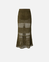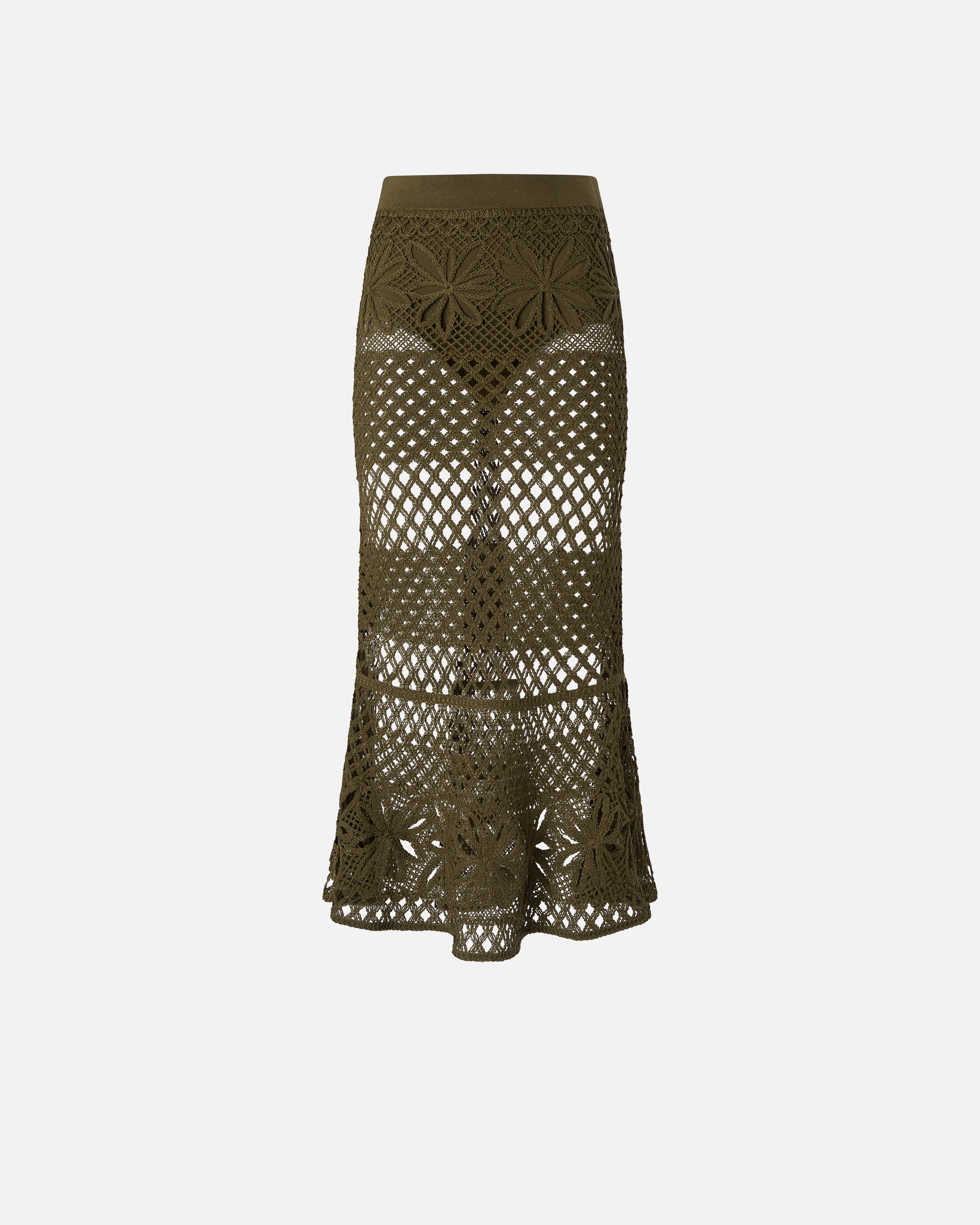 CRISPO SKIRT − 104732A2FFX26 Long, slim-fitting skirt in fancy crochet-effect mesh yarn in which a diamond pattern and striking floral motif alternate. Due to the see-through perforated material, the garment comes with technical fabric slip shorts to wear underneath. Bold, feminine and ultra-summery, this skirt evokes evenings on the beach at sunset the moment you see it. COMPOSITION : VISCOSE 75% POLYAMMIDE 25% POLYAMIDE 25% - : POLYESTER 100% - Lining: POLYESTER 95% ELASTANE 5% - Body lining: POLYESTER 95% ELASTANE 5% - Sleeve lining: POLYESTER 95% ELASTANE 5%