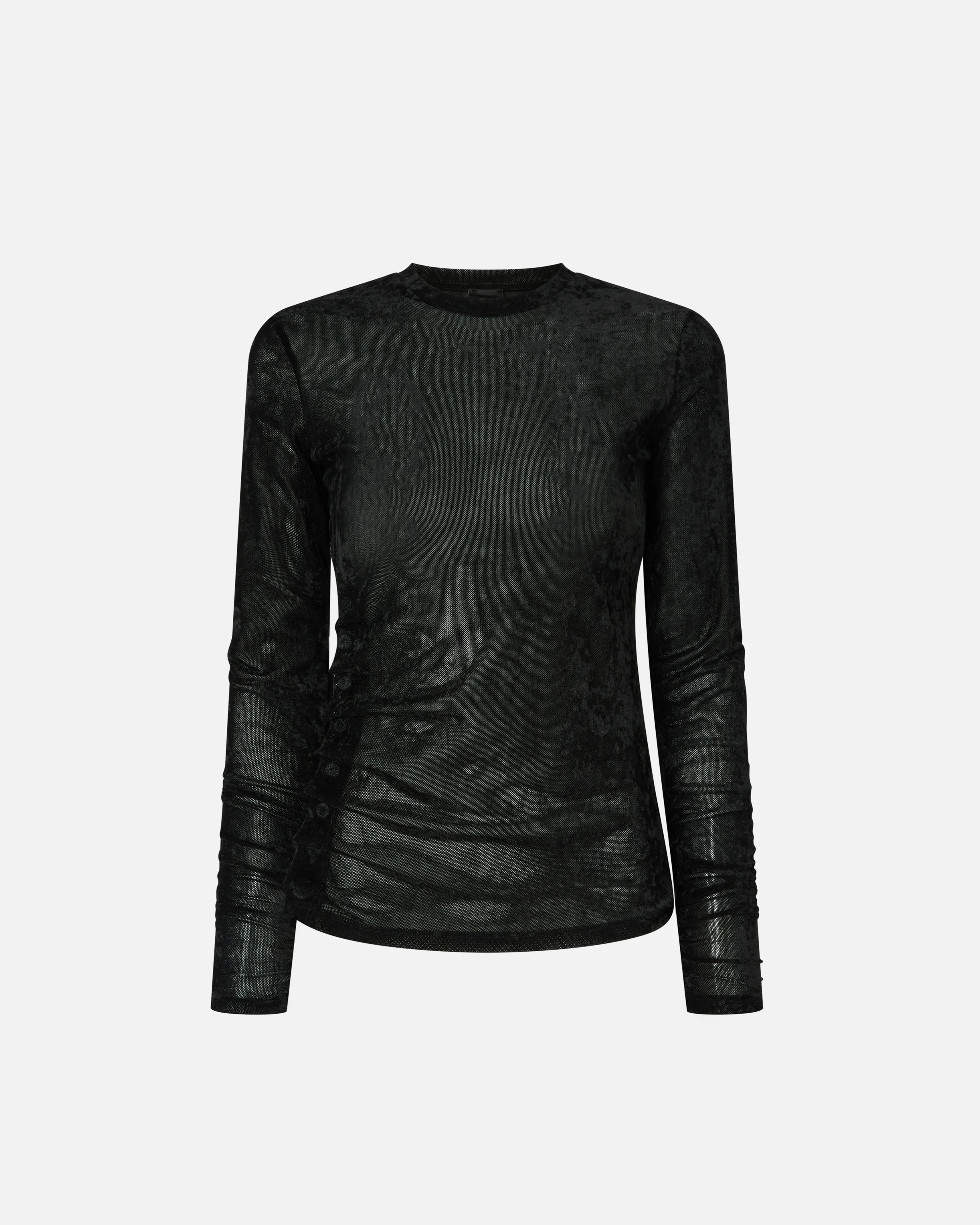 CARMINA KNITWEAR − 106092A307Z99 Long-sleeved shirt in lightweight, transparent fabric with a flock pattern that creates a textured pattern on the surface. The fitted construction flatters the silhouette, while the see-through effect gives the garment a sensual and sophisticated allure. Perfect to wear under an oversized blazer or with high-waisted trousers for a bold and refined look. COMPOSITION Outside Fabric: POLYESTER 90% ELASTANE 10%
